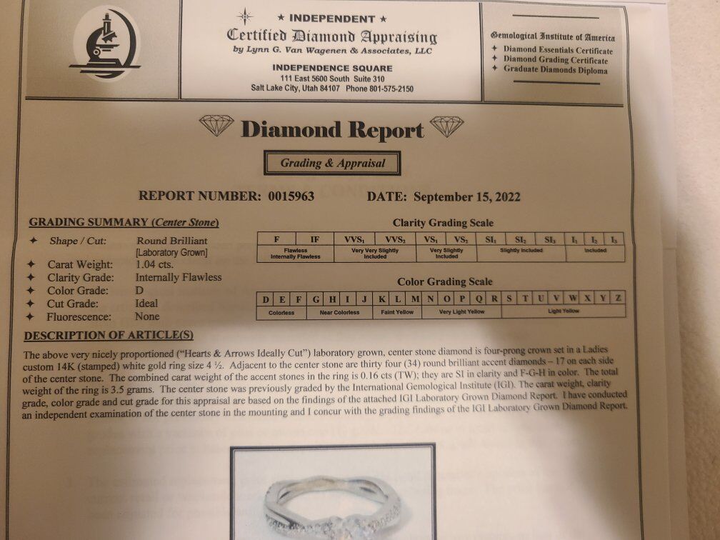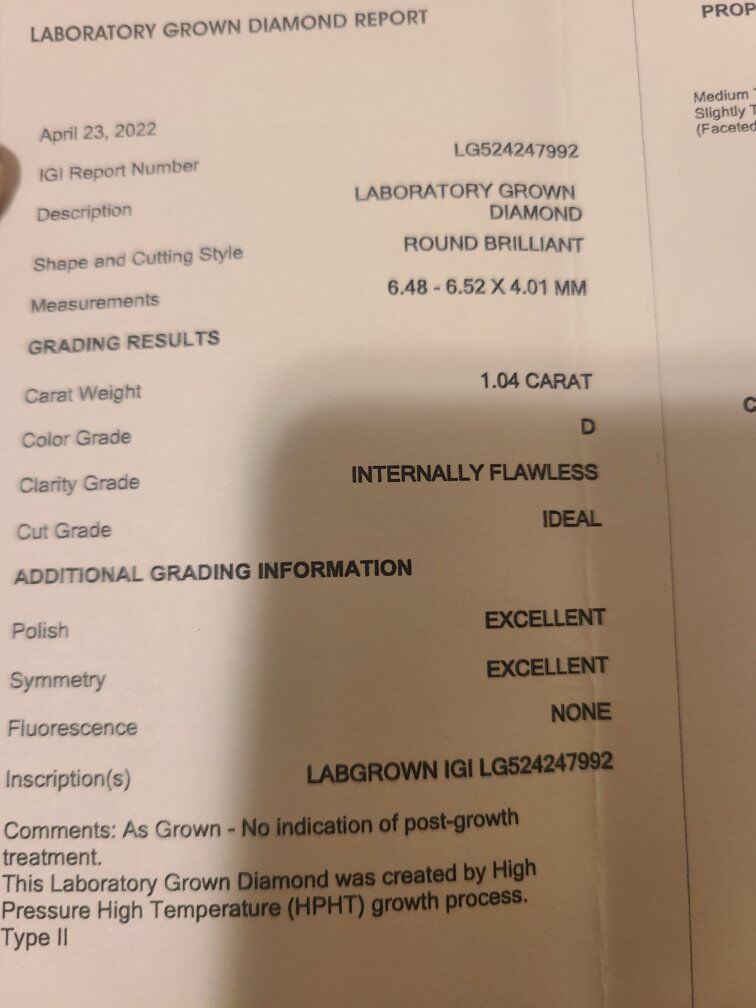 ZelleShape / Cut: Round Brilliant Carat: 1.04 cts Clarity Grade: Internally Flawless Color Grade: D Cut Grade: Ideal Fluorescence: None Polish: Excellent Symmetry: Excellent