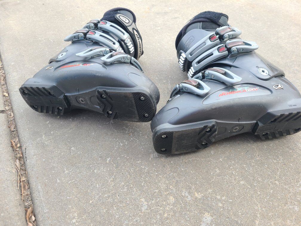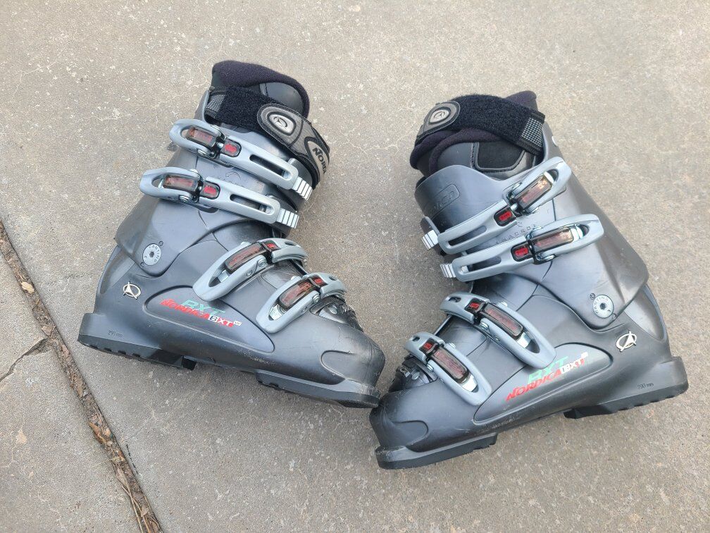 ski boots 25 to 25.5, fits Mens 7 to 7.5 and womens 8 to 8.5.