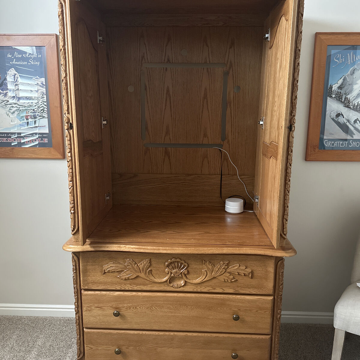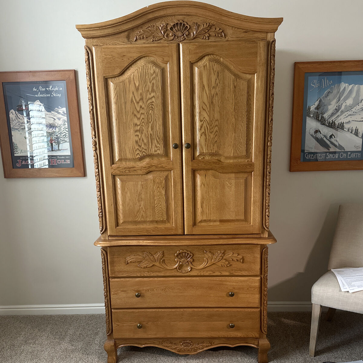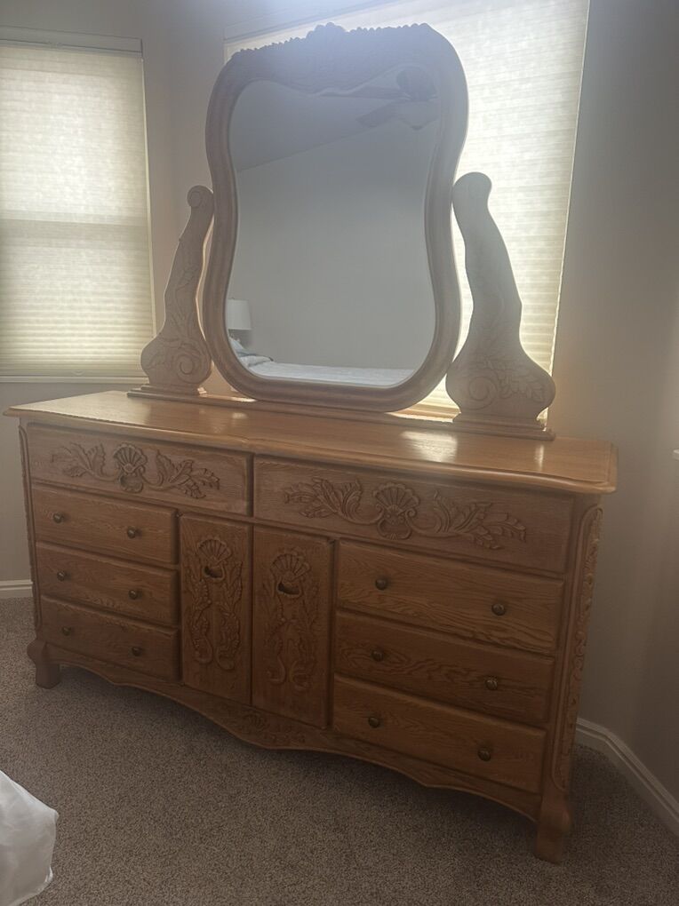 Venmo8 piece solid oak king size bedroom set. Excellent condition. Two piece armoire, headboard and footboard, dresser with mirror, two night stands. Price includes mattress and box springs.