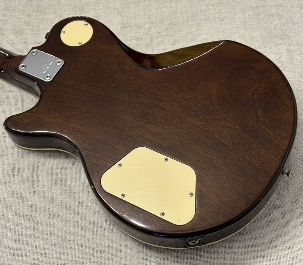 The PF100 features a birch top with cream binding on a single-cutaway mahogany body bolted to a laminated rock maple neck with a 22-fret ebonized rosewood fingerboard with pearloid dot position markers. Components include a pair of Ibanez Super 70 humbucking pickups with chrome covers mounted in cream pickup rings with individual volume and tone controls, a Tune-o-matic style Gibraltar fixed bridge with Quik Change tailpiece, a cream pickguard and Smooth Tuner II machine heads. The output is mounted on the side of the guitar.