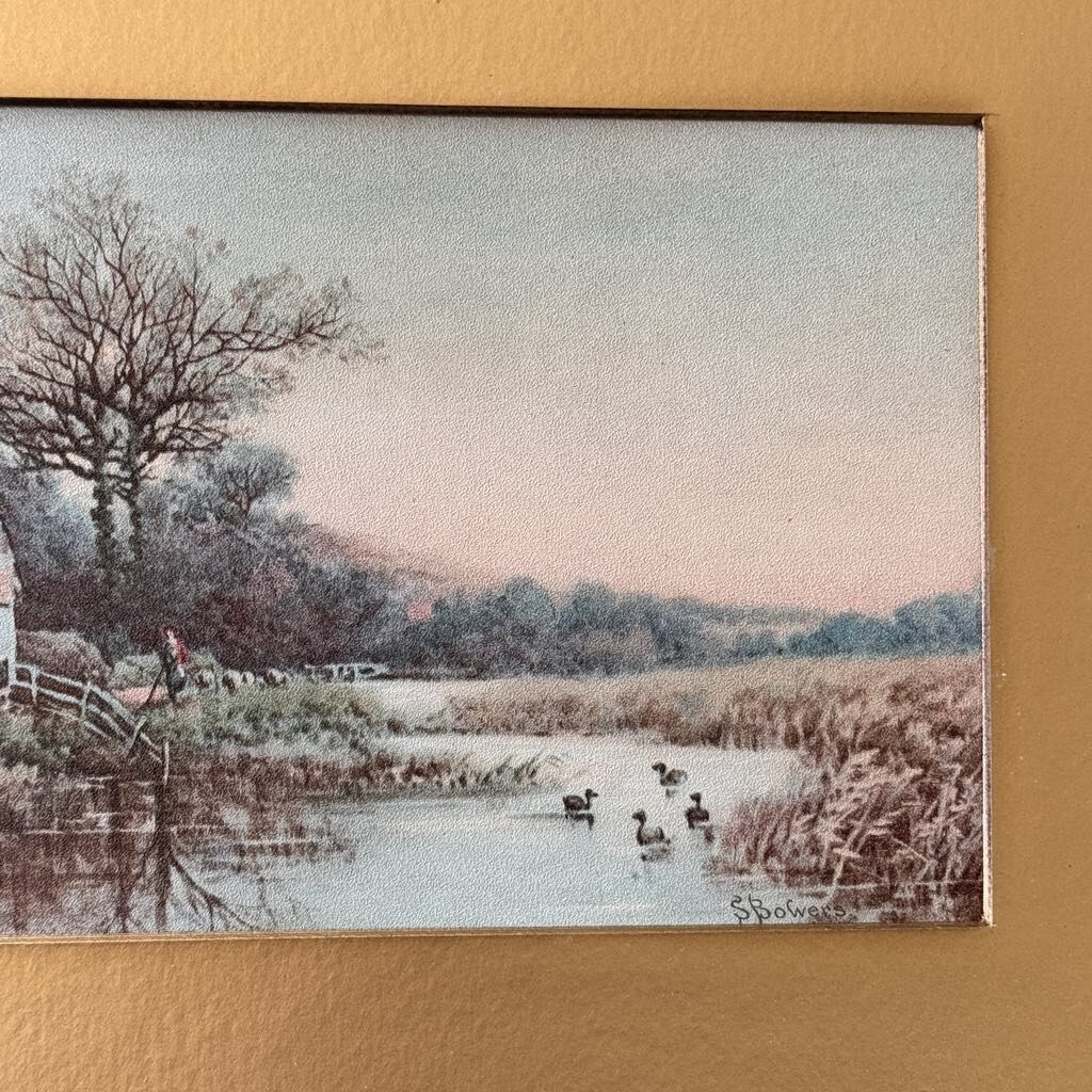 The gold matte surrounding the artwork has a broken corner in the upper right as well as some other cracks/chips.