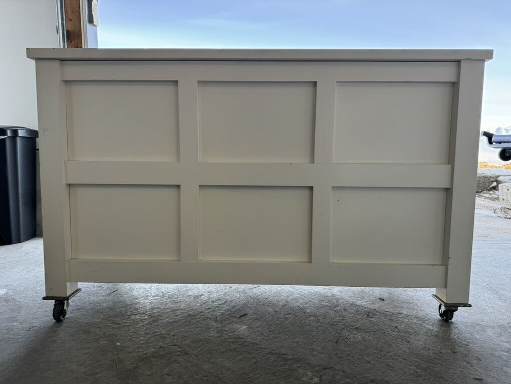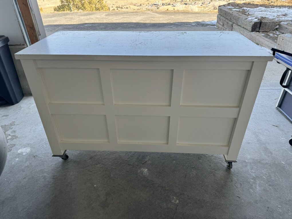 Venmo2 available repurposed retail rolling shelf: 48”L x 21”W x 29”H, wood construction, casters, 2 drawers + open shelves, solid & mobile for workshop/garage/storage. • Good condition with light wear/patina (drawers need minor oil); $price is each OBO