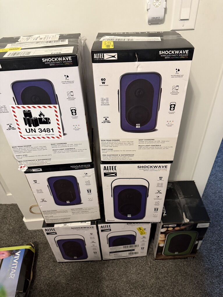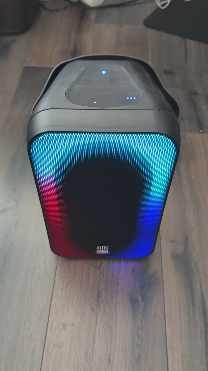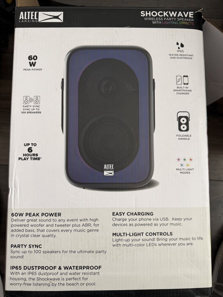 ApplePay60 watt IP65 Water Resistant and Dustproof Up to 6 hours play time Party Sync-up to 100 speakers Multi-light controls Charges with USB-C cable Charge your phone with the USB out 3.5 mm input All controls accessible on speaker: play, pause, volume, next, back, etc Great sound