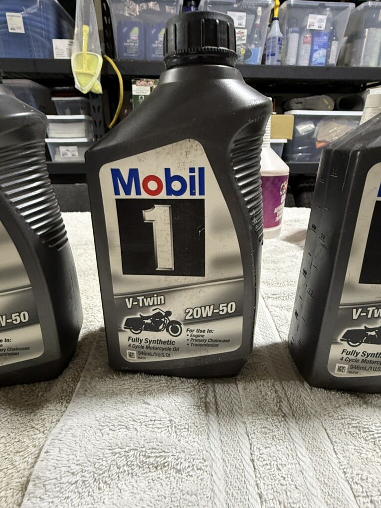 ZelleThree bottles of Red Line 10-W40 motorcycle oil. Four bottles of Red Line 20-W50. Five bottles of Mobile One V twin 20-W50 motorcycle oil.