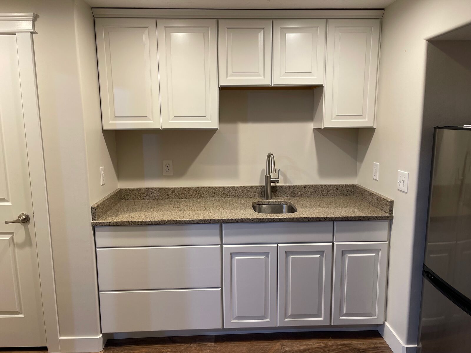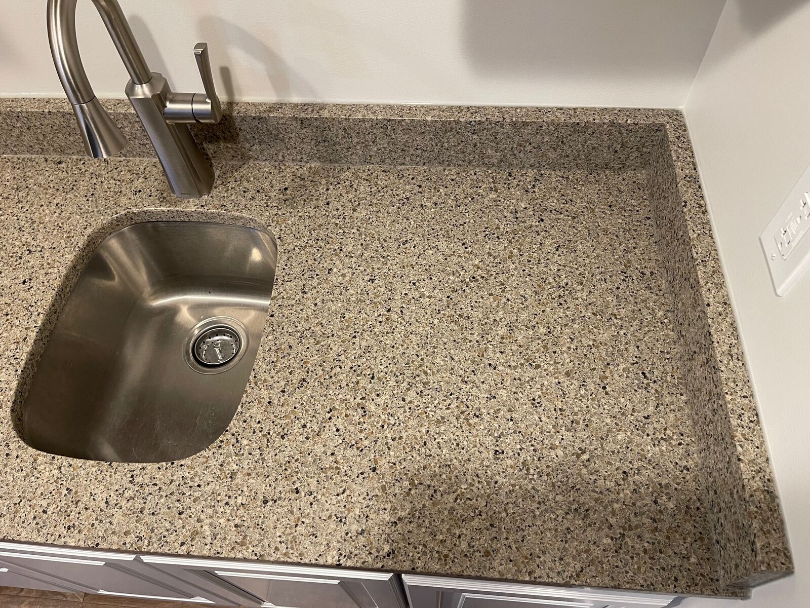 White Water 78" Quartz Countertop configured for a basement bar. It includes a stainless-steel sink and a Moen S62608SRS bar faucet. The cabinets are not included. For reference, left side pull out drawers are a standard 33" base, the sink cabinet is 30" and the pull-out right-side garbage base is 15". This basement bar has rarely been used. We are reconfiguring the basement and this countertop no longer fits our needs.