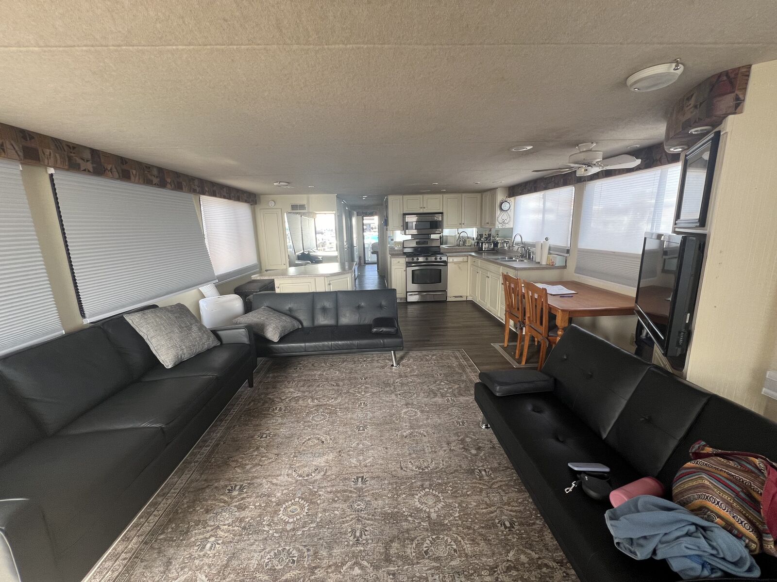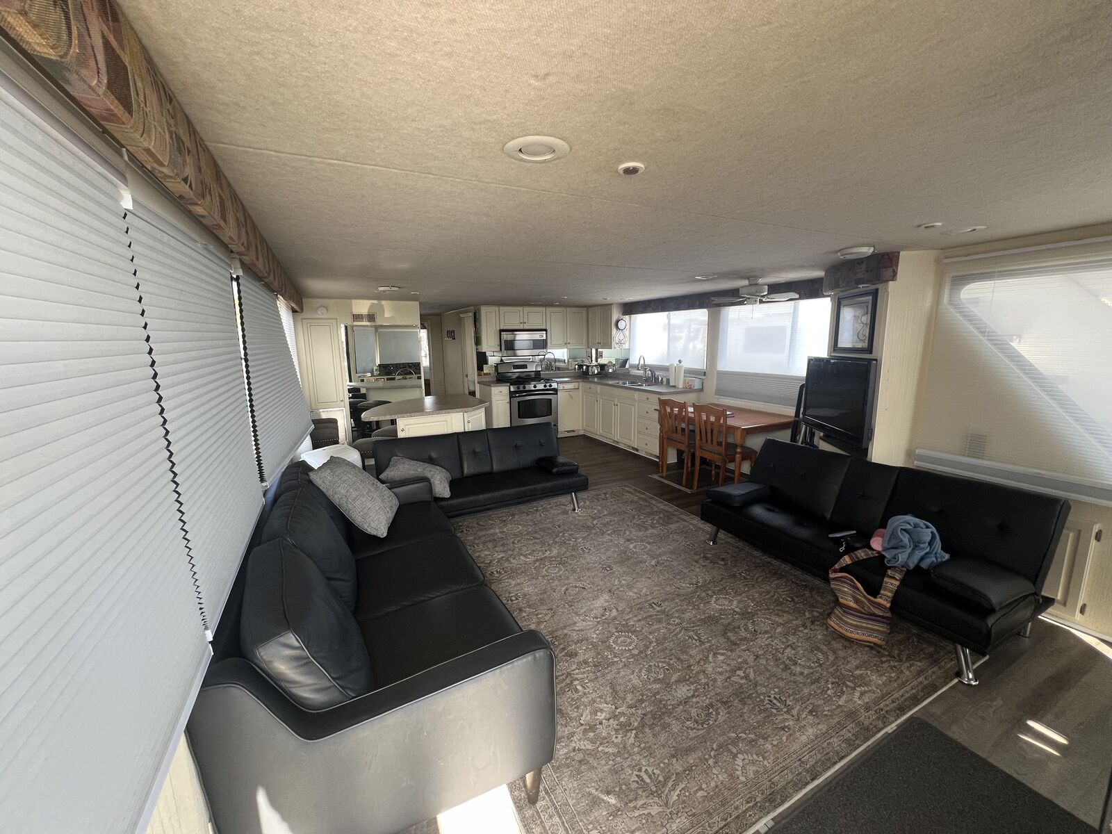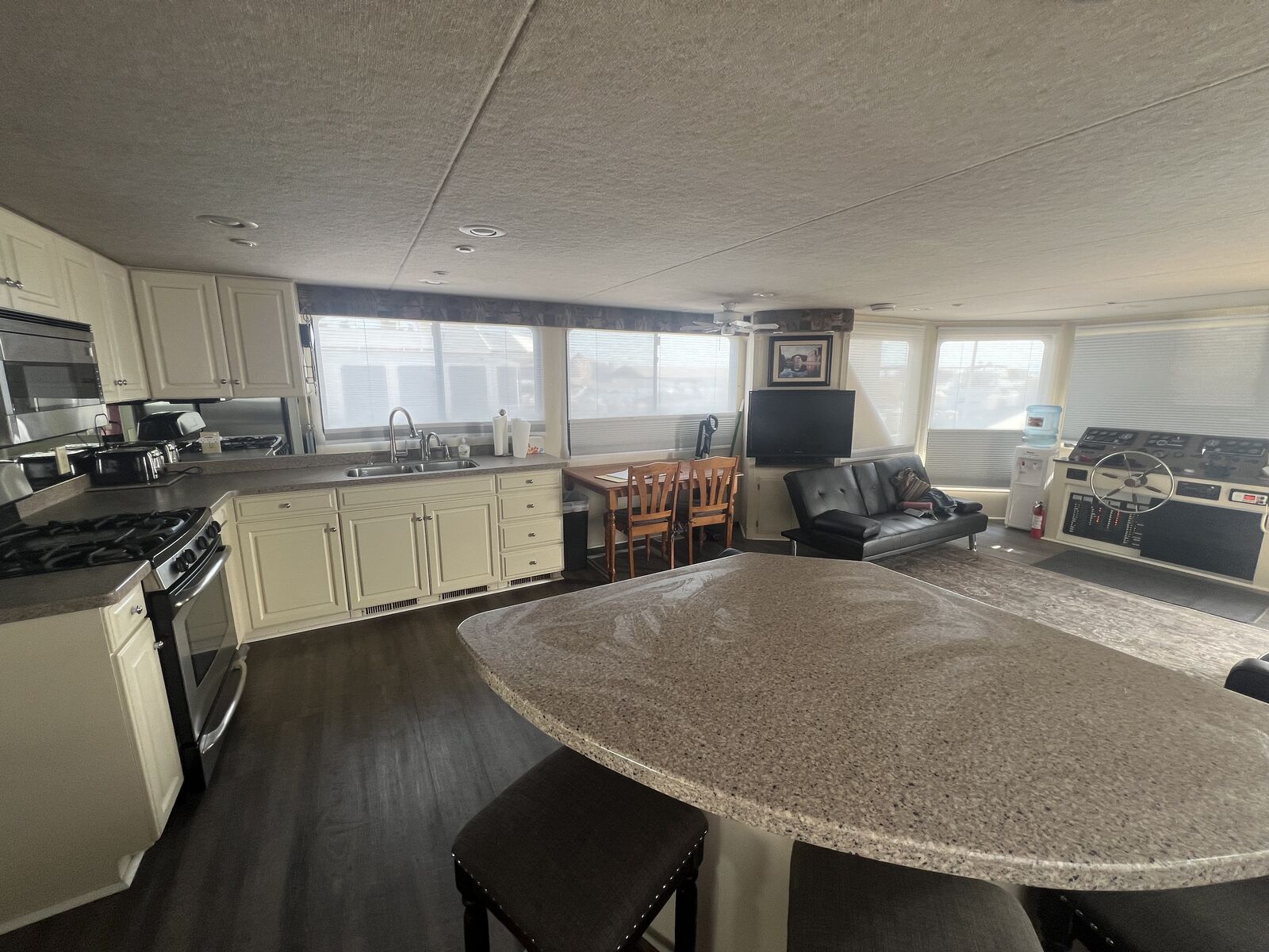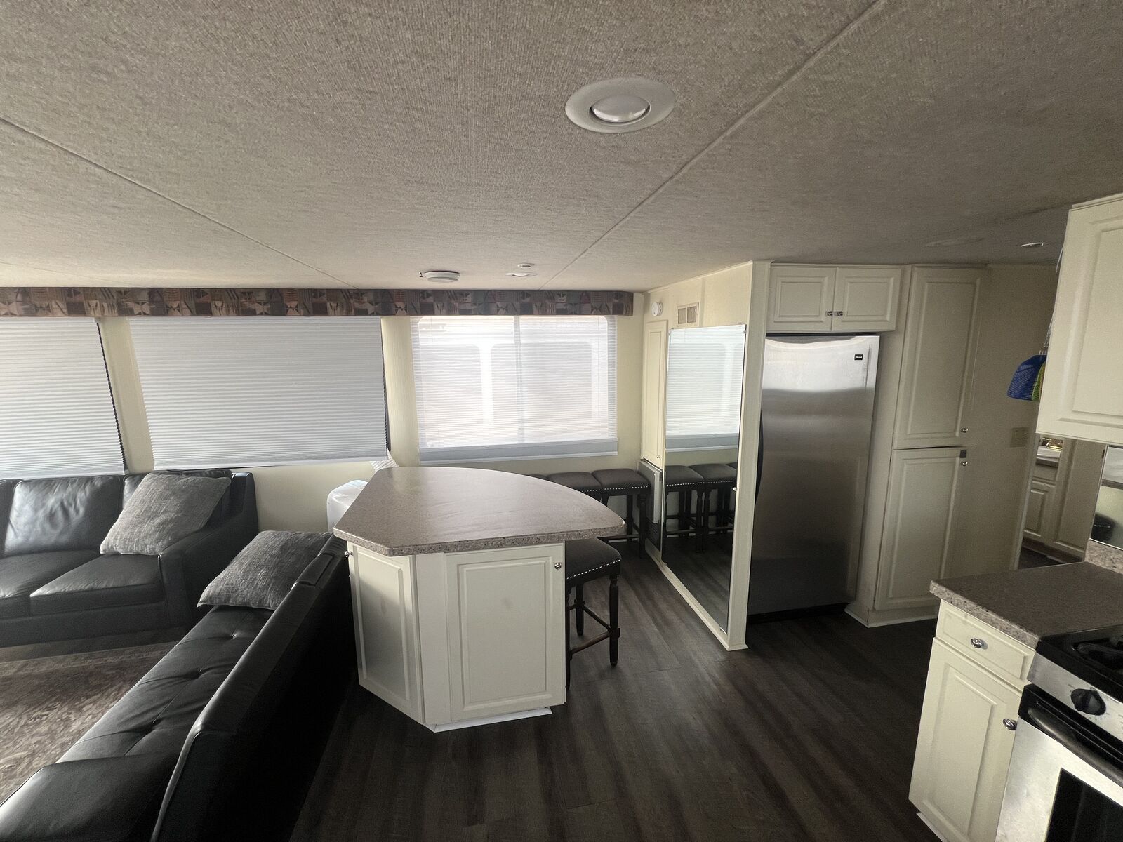 Plenty of deck space up top including a bar with sink and beverage fridge, 2 freezers, 12 sleeping pads and metal awning with lots of shade and multiple lounge chairs. 2 paddle boards, 3 kayaks, 2 lily pads and a slide off the back. Also has folding tables and tons of folding chairs. New last year we added some amazing floating toys (see pics).