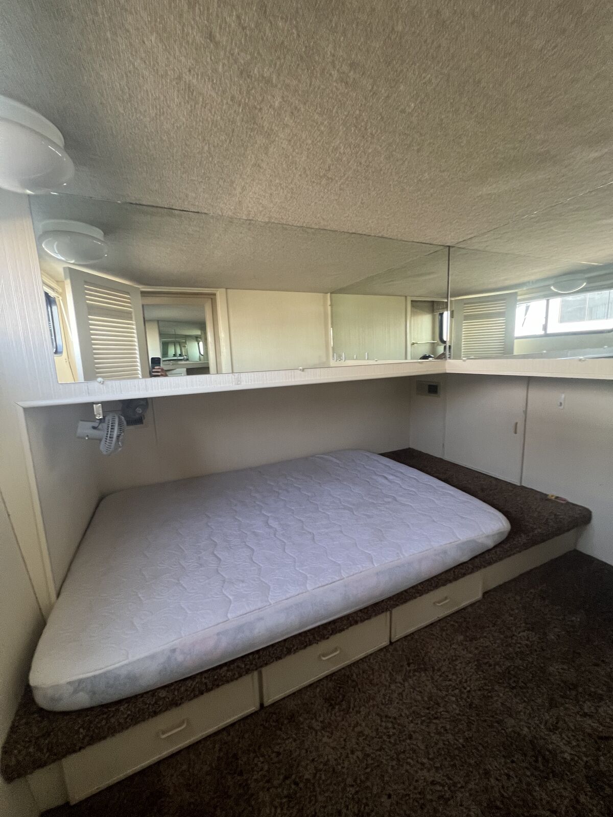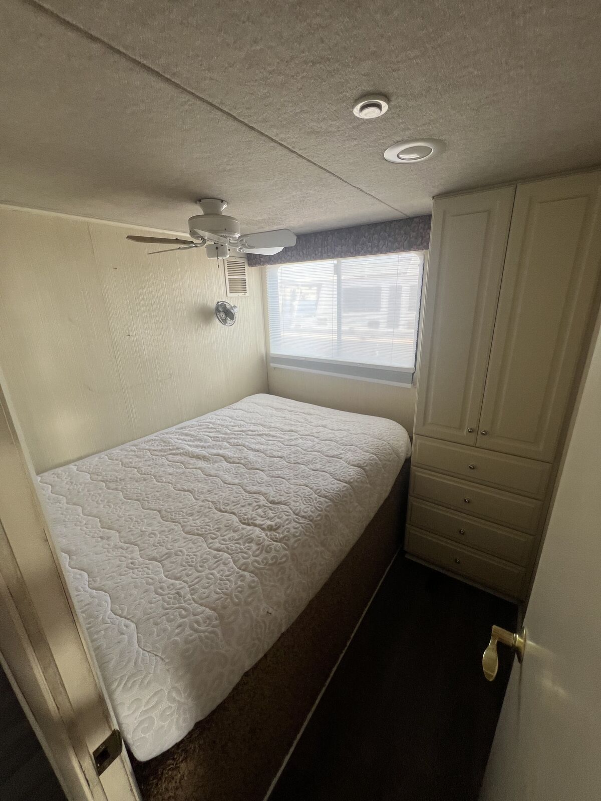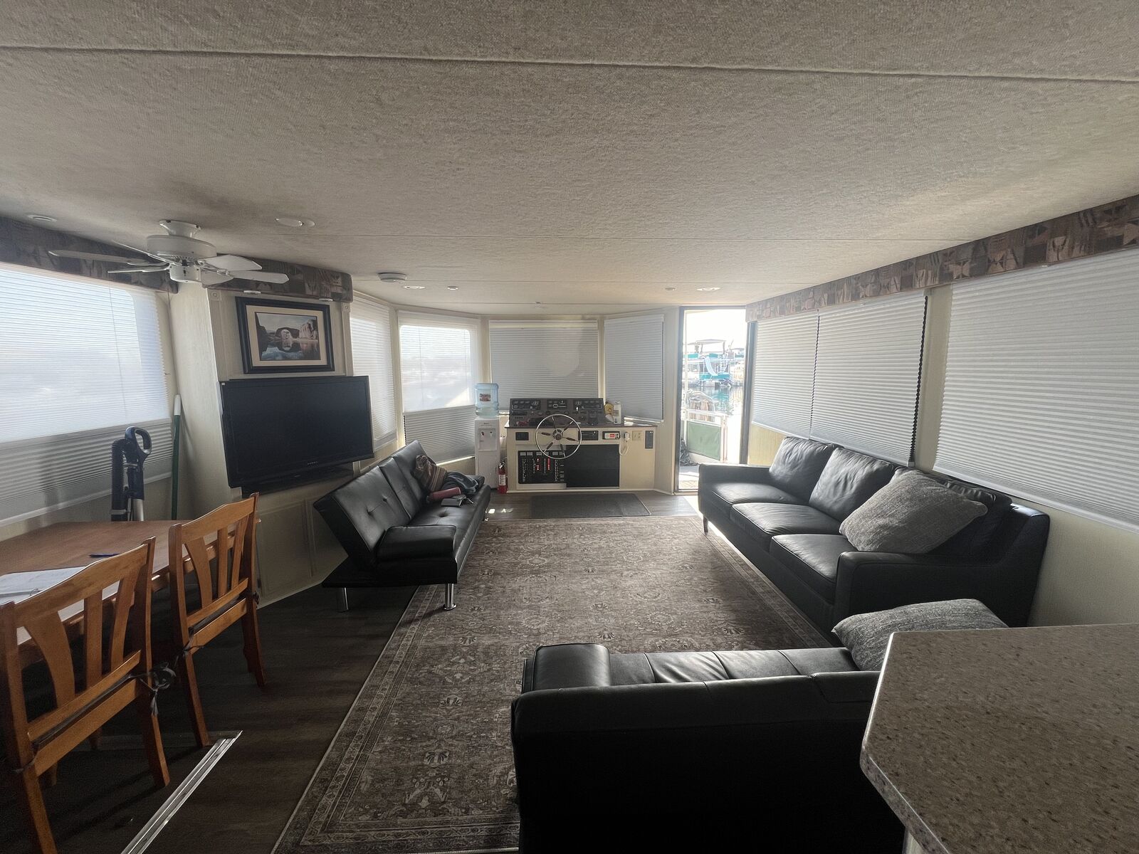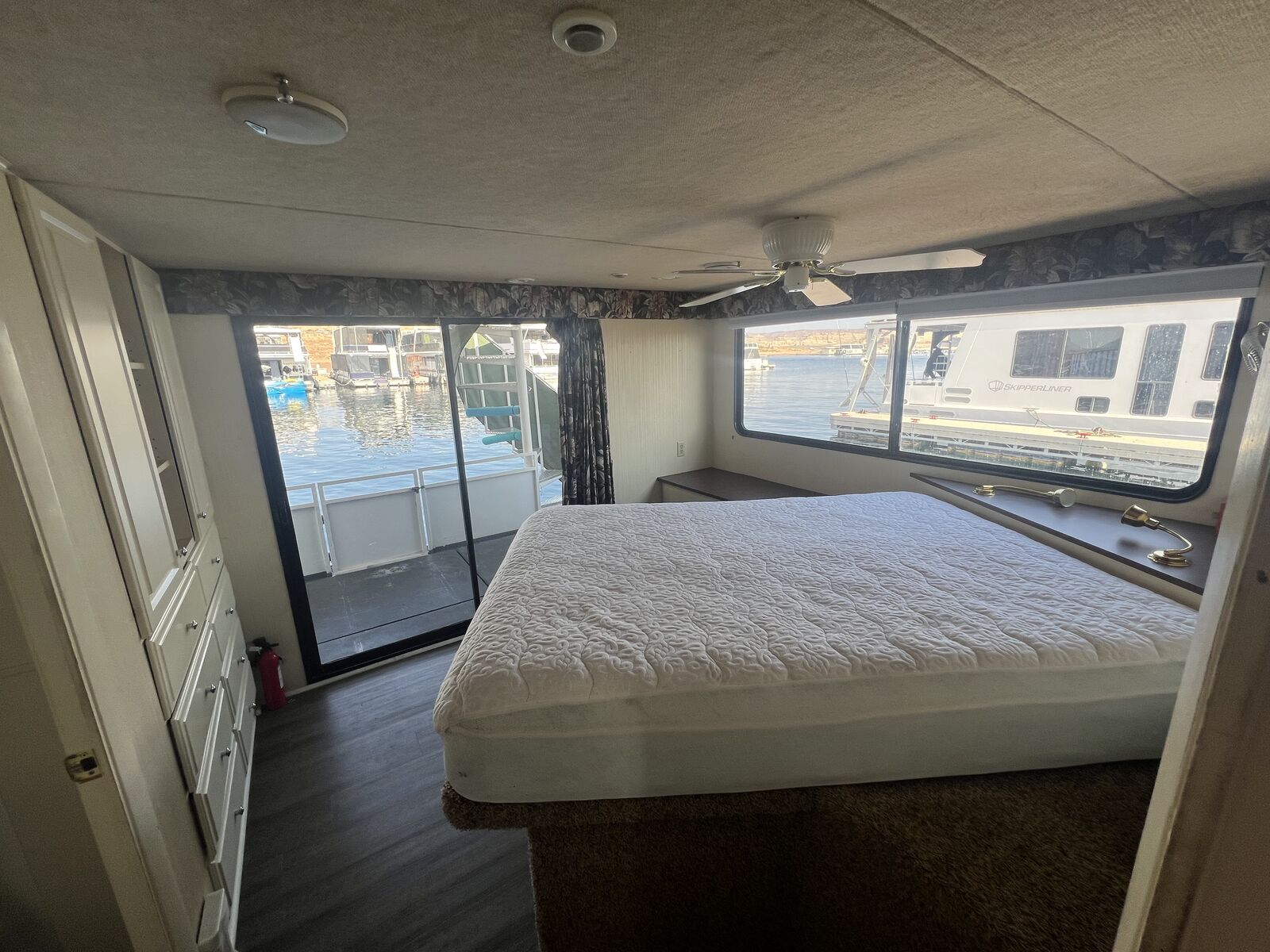 Boat is 60ft long, 14' wide. It has 4 private bedrooms each with queen beds and storage, 2 futons, 1 large couch and 2 full bathrooms. Fresh interior paint throughout!