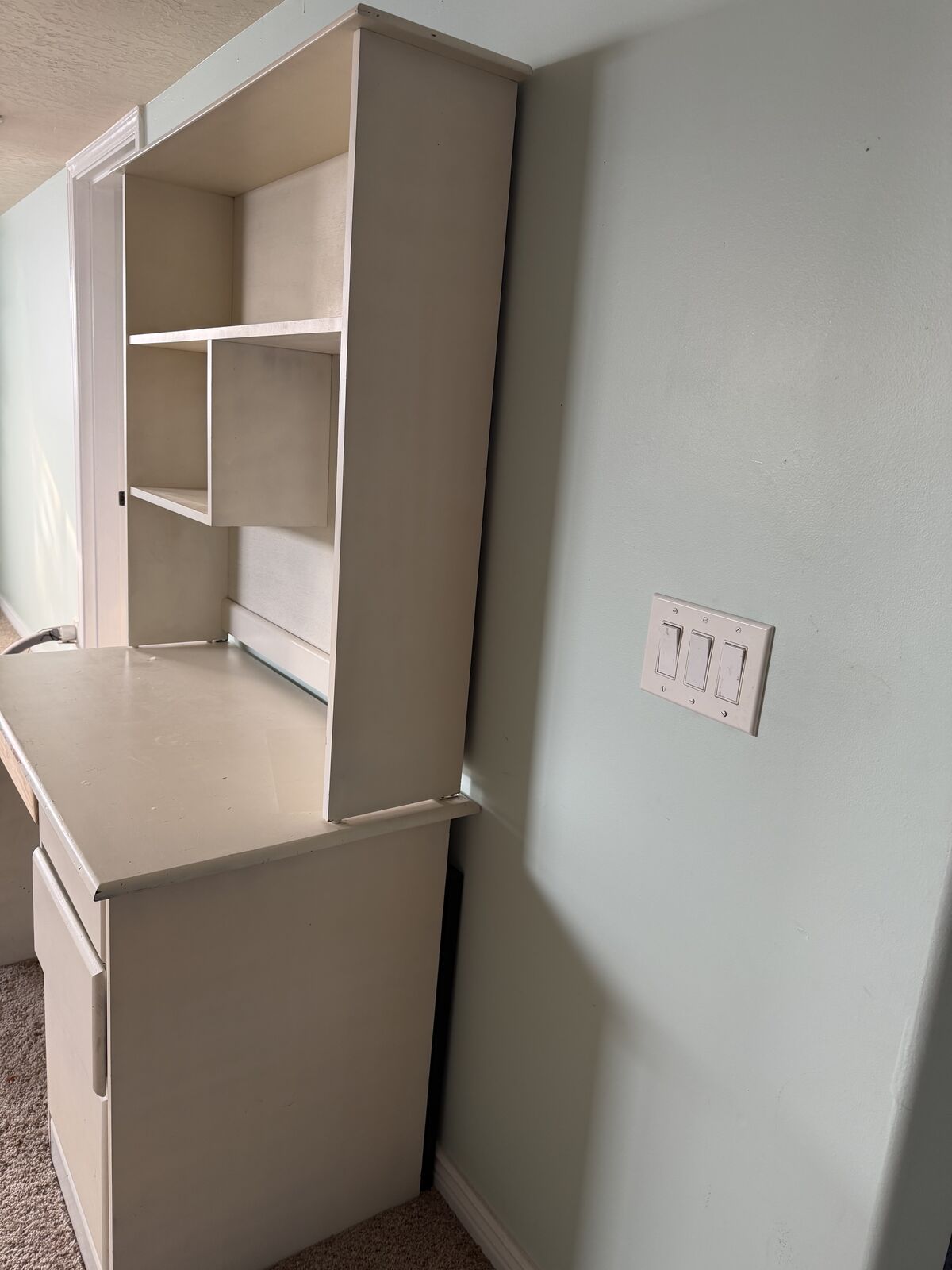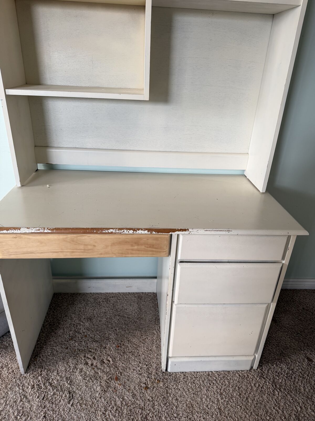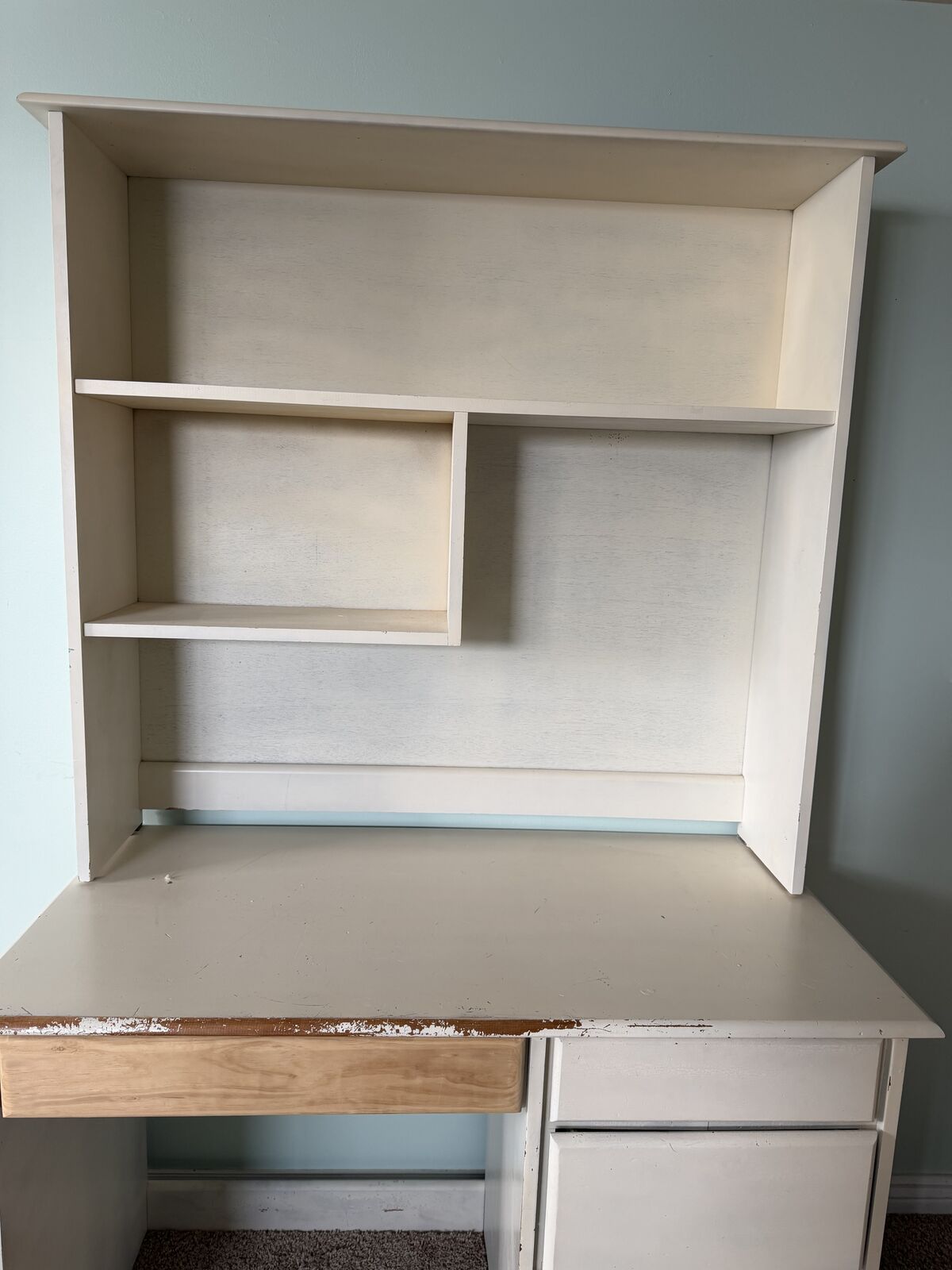 VenmoCream colored hutch. Great for storing dishes, books, etc or using as a desk space. The top shelving is stackable on the desk (so you can remove it and just use the desk.) One of the drawers has been replaced and just needs a quick coat of paint. (paint is included)