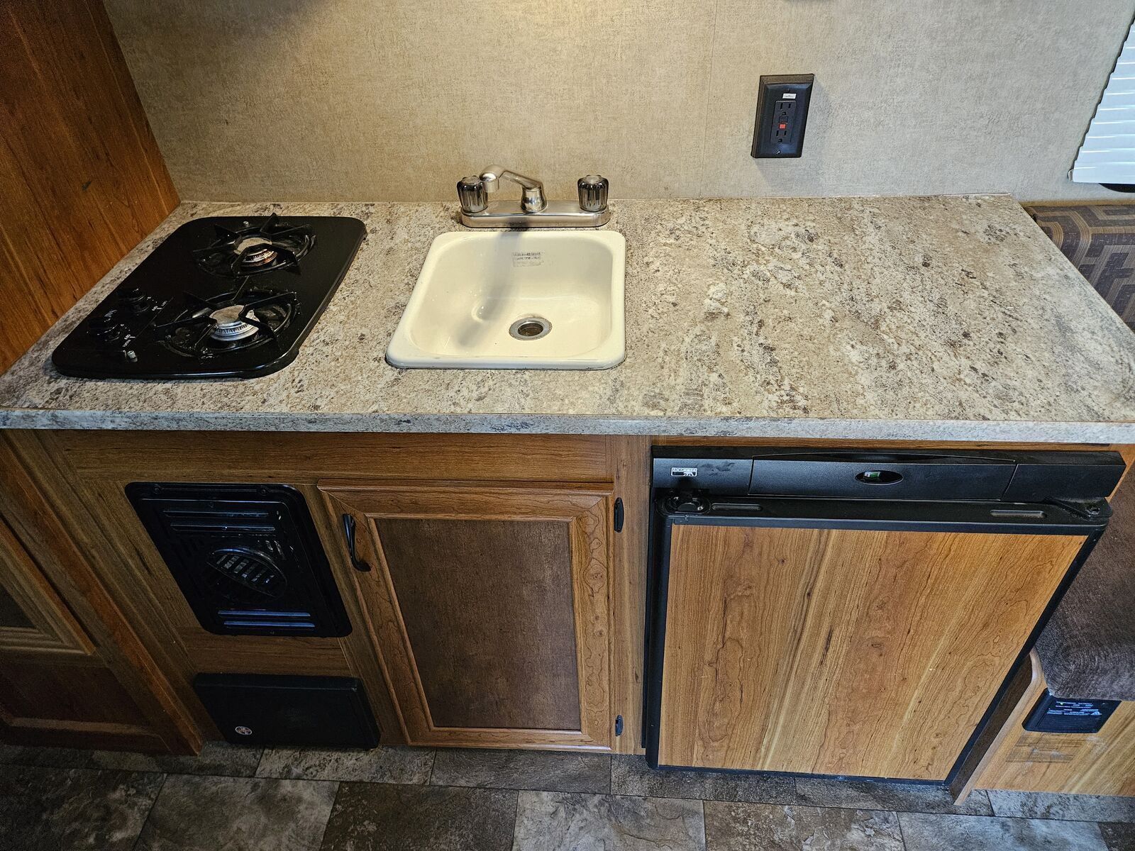 Kitchen has Under-Counter Fridge with Freezer, 2 Burner Cooktop with Range, Microwave, and Sink!