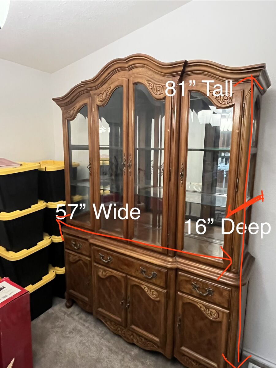 We are selling our gorgeous two piece hardwood China cabinet! It has a mirrored back wall, glass windows and glass shelves with intricate wood trim. All original finishes. The piece is in excellent condition, showcasing the beauty of its era.