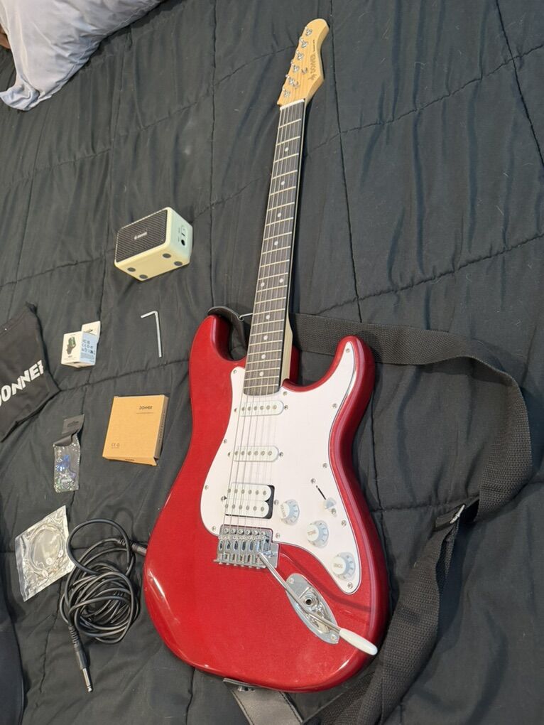 ApplePayIncludes Guitar, Guitar case, capo, tuner, extra cords, multiple pics, amp, strap and case.