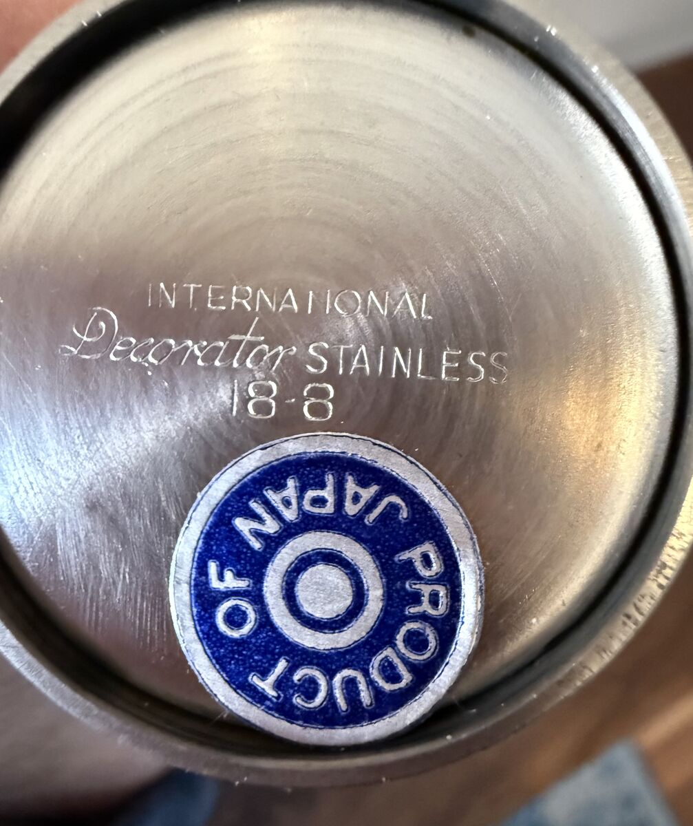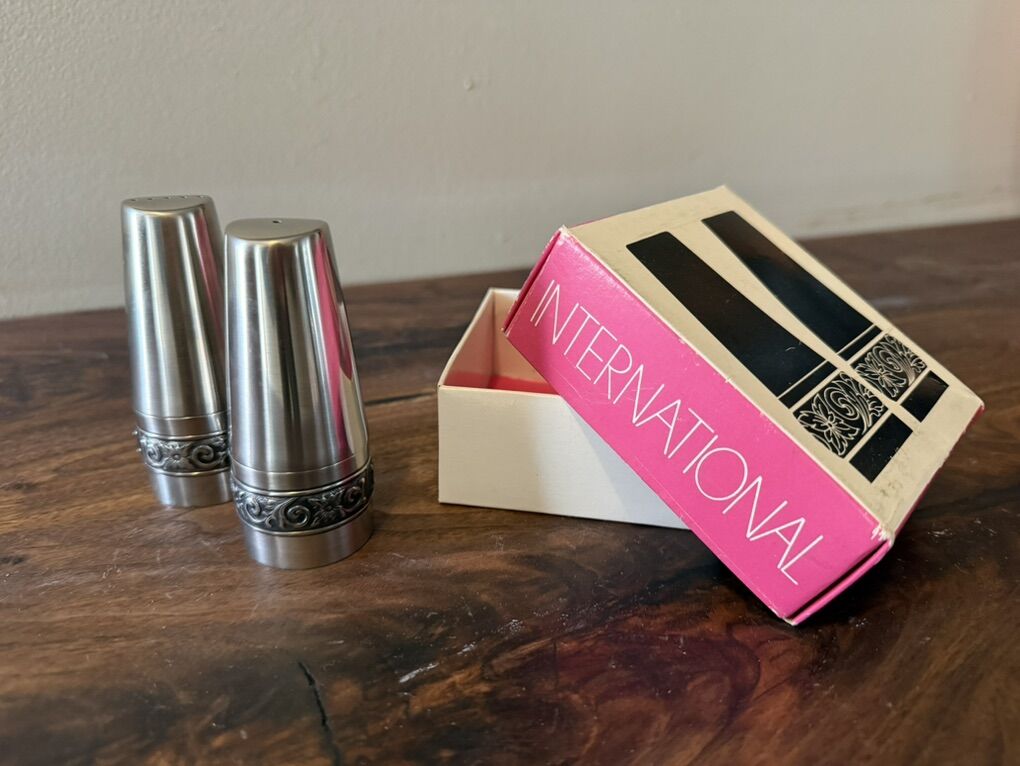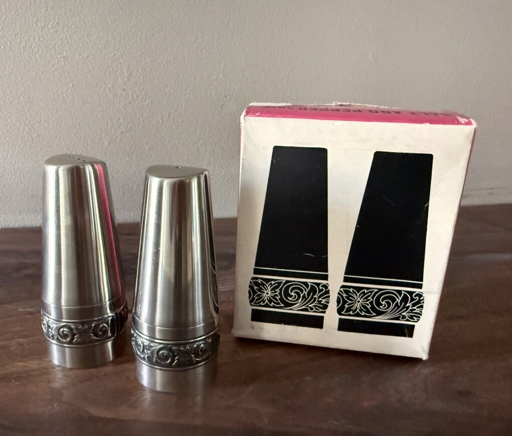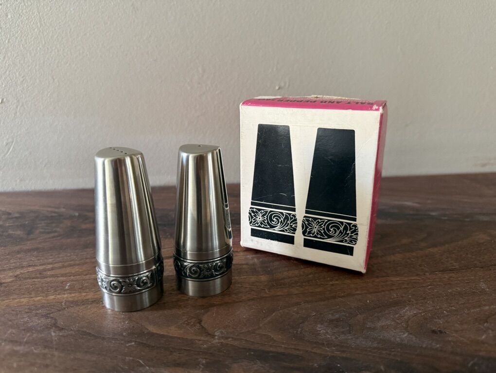 VenmoMid-Century pair of salt and pepper shakers. Stainless steal. 3.5 inches tall. Great condition. They have been kept in the original box and covers and don’t appear to have been used. Marked on bottom as noted in photos. Circa 60-70s