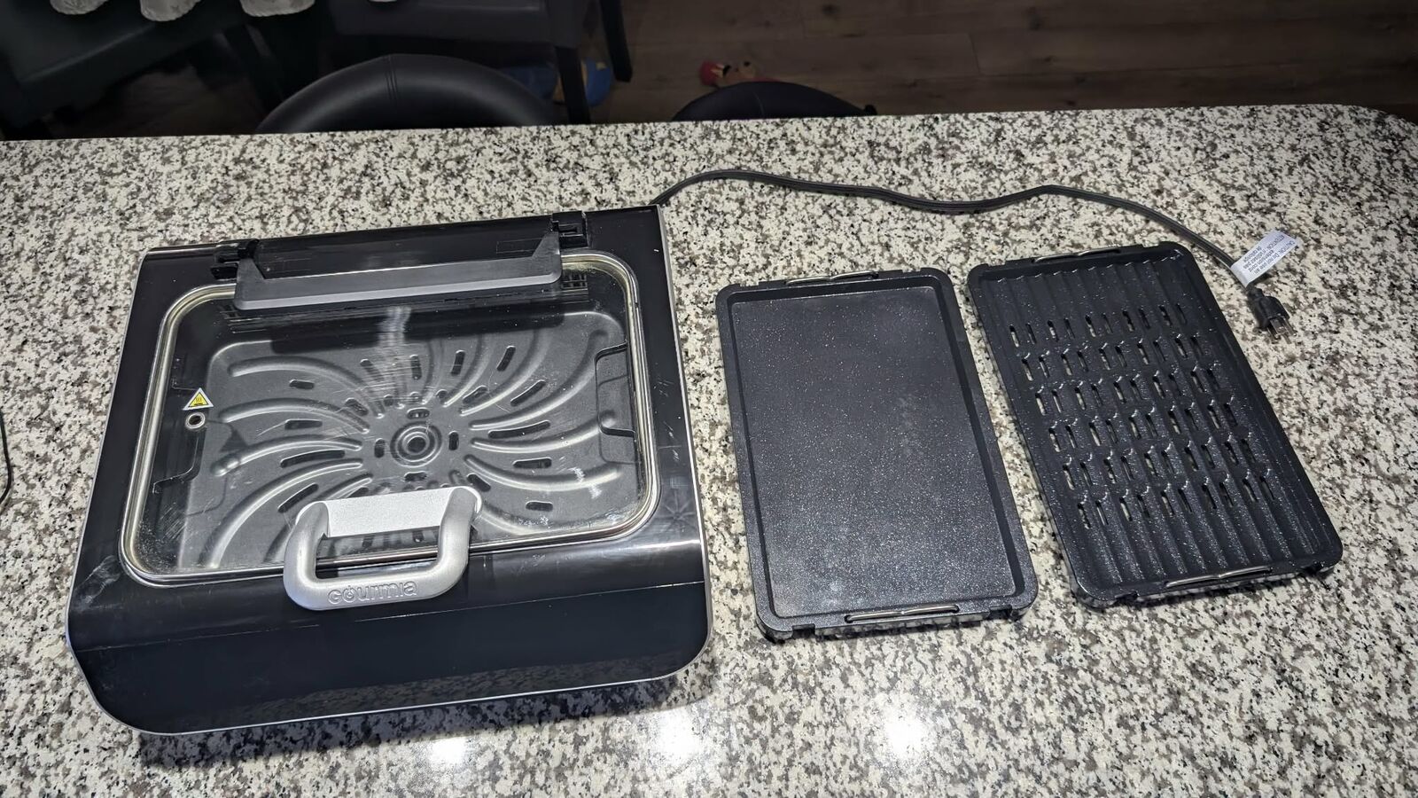 VenmoGourmia Smokeless Indoor Grill & Air Fryer raclette grill with Smoke Extracting Technology Extra-Large Nonstick Cooking electric grill indoor Korean BBQ Style 6 Quart FoodStation™SMOKELESS GRILL: indoor grills electric smokeless extraction with direct contact heat from below onto an inlaid heavy duty cast-metal grate for the perfect indoor electric barbecue gril
