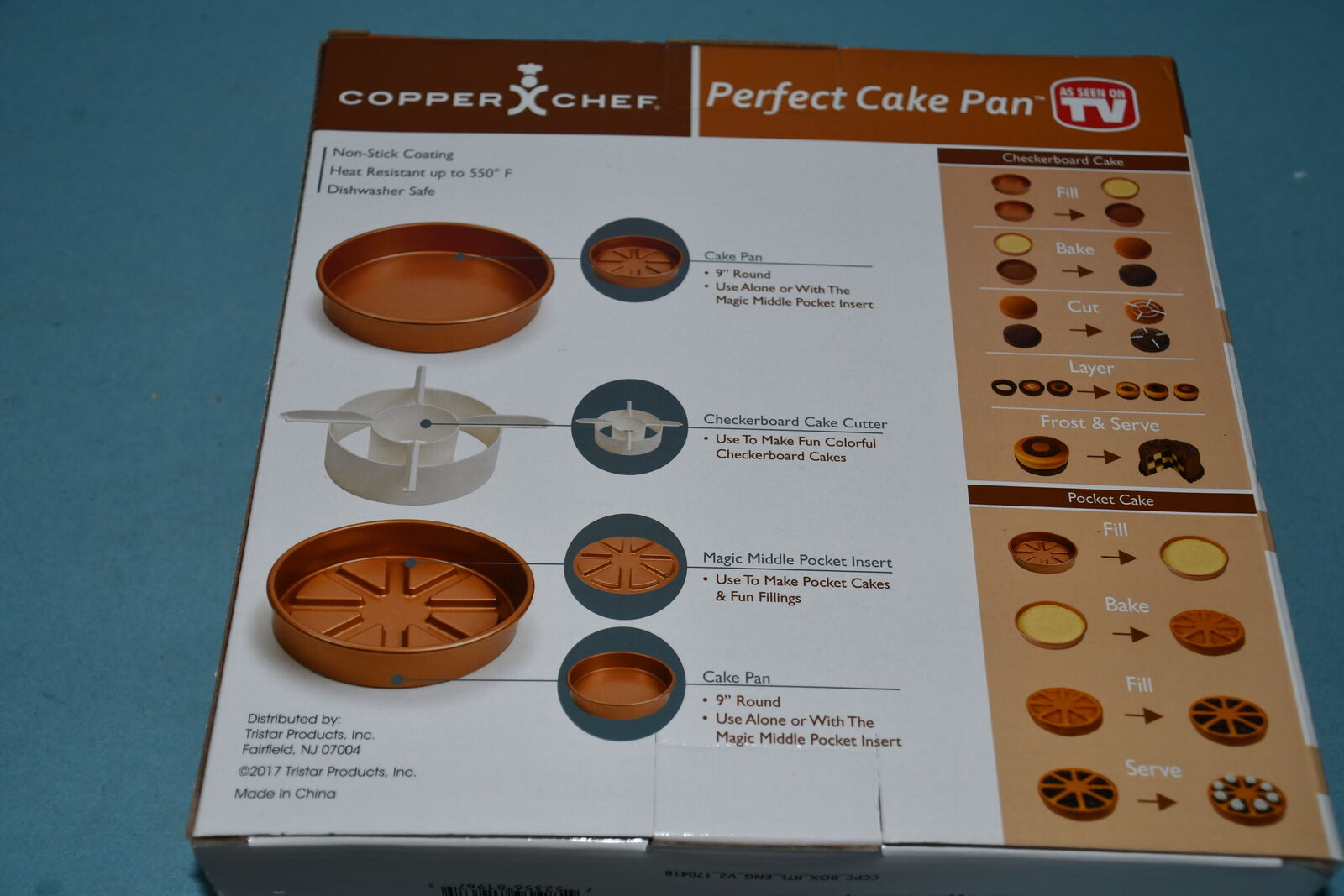 This NIB COPPER CHEF "PERFECT CAKE PAN" makes 3 Types of Cakes. It is 9" ROUND with a NON STICK COATING. Our home is smoke free. Questions??? Please ask. We are located in Plain City. Cash only please.