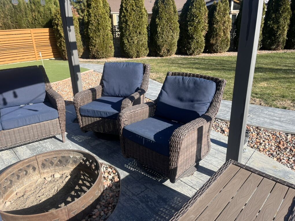 VenmoGreat deal for the 3 separate pieces but all as one, A sectional type couch, 2 rocking chairs, and one long bench all had been great to use, we are moving no longer needed. Asking 750 OBO first come first serve, if this is up it is still for sell don’t ask if it is still available.
