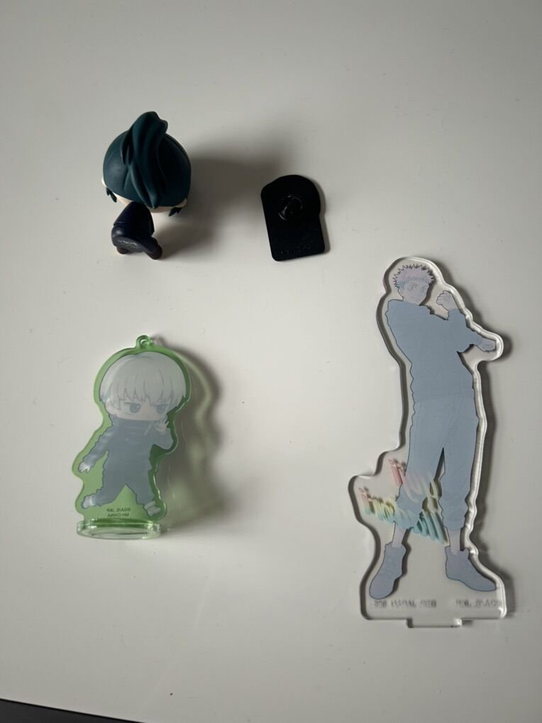 Merch for Gojo, Yuji, Nobara, and Maki The Yuji stand is missing the bottom part, otherwise all good