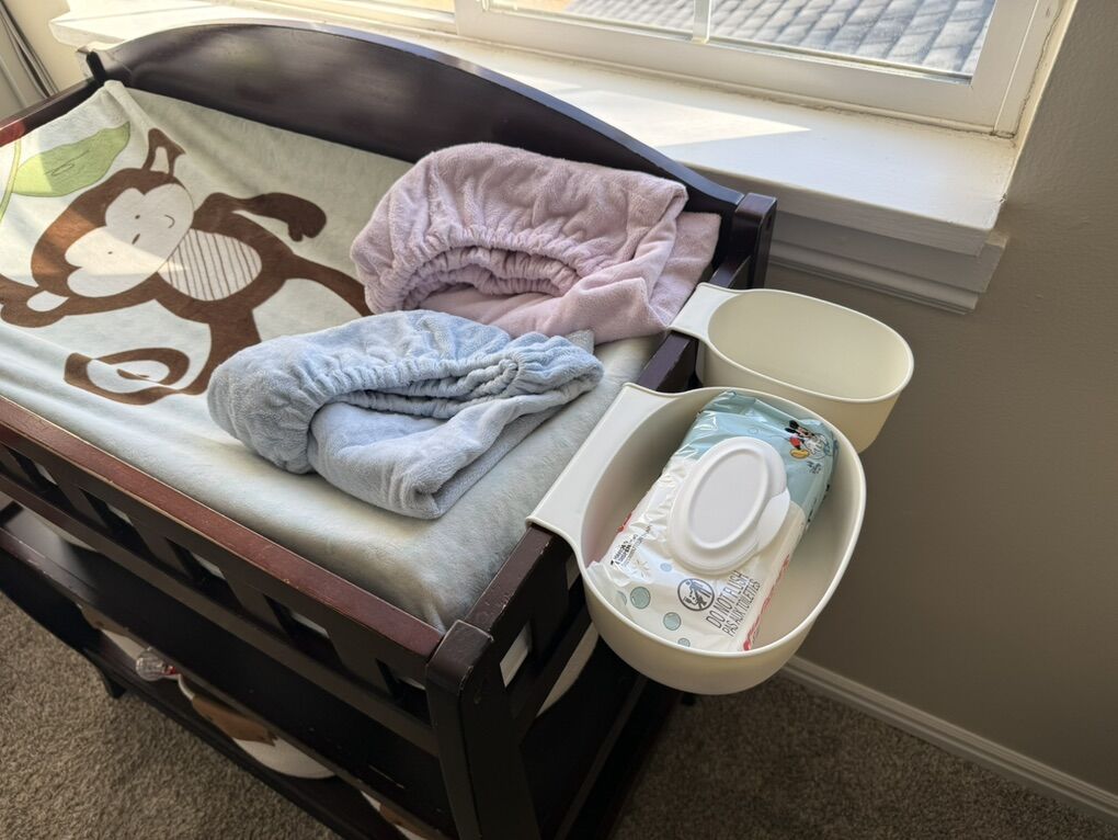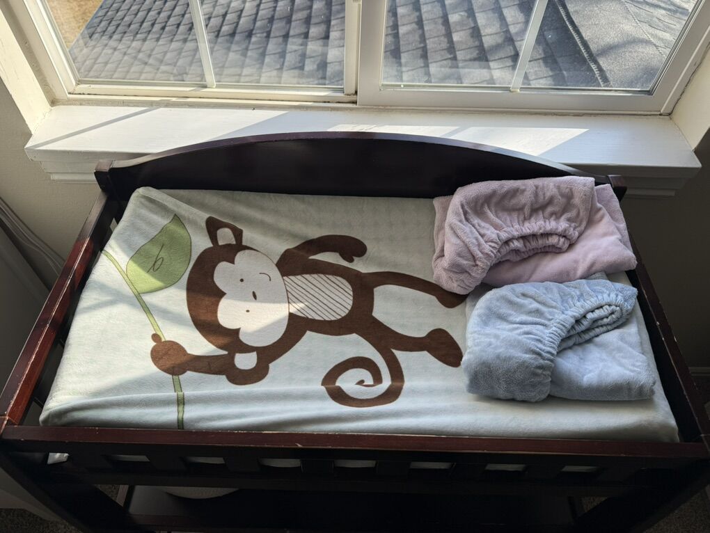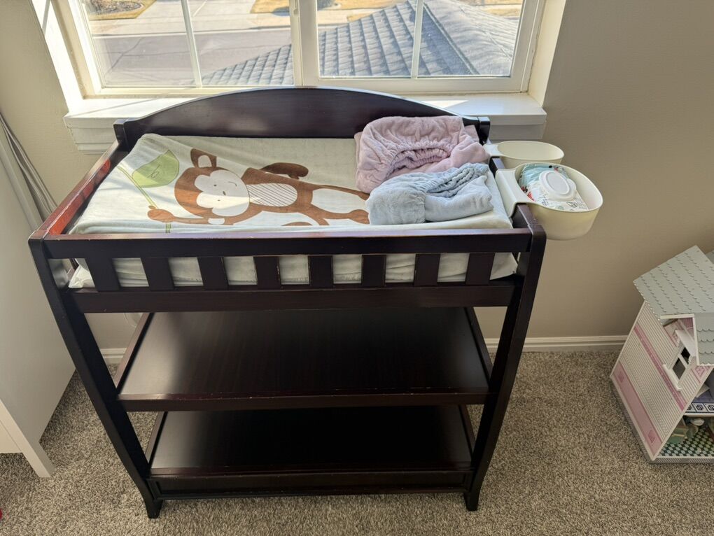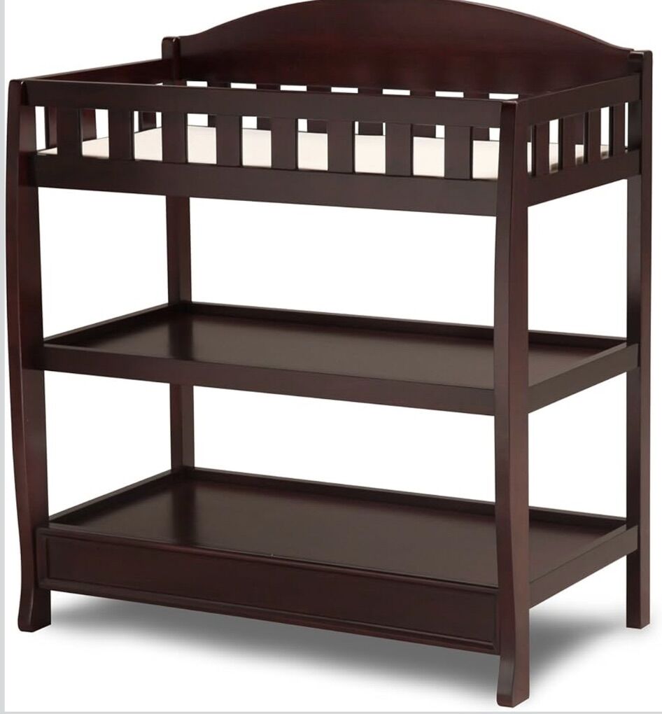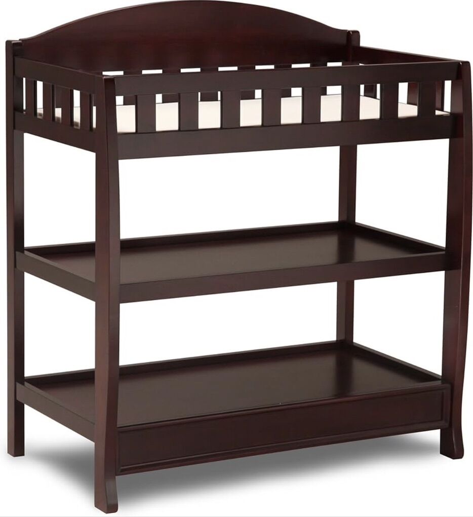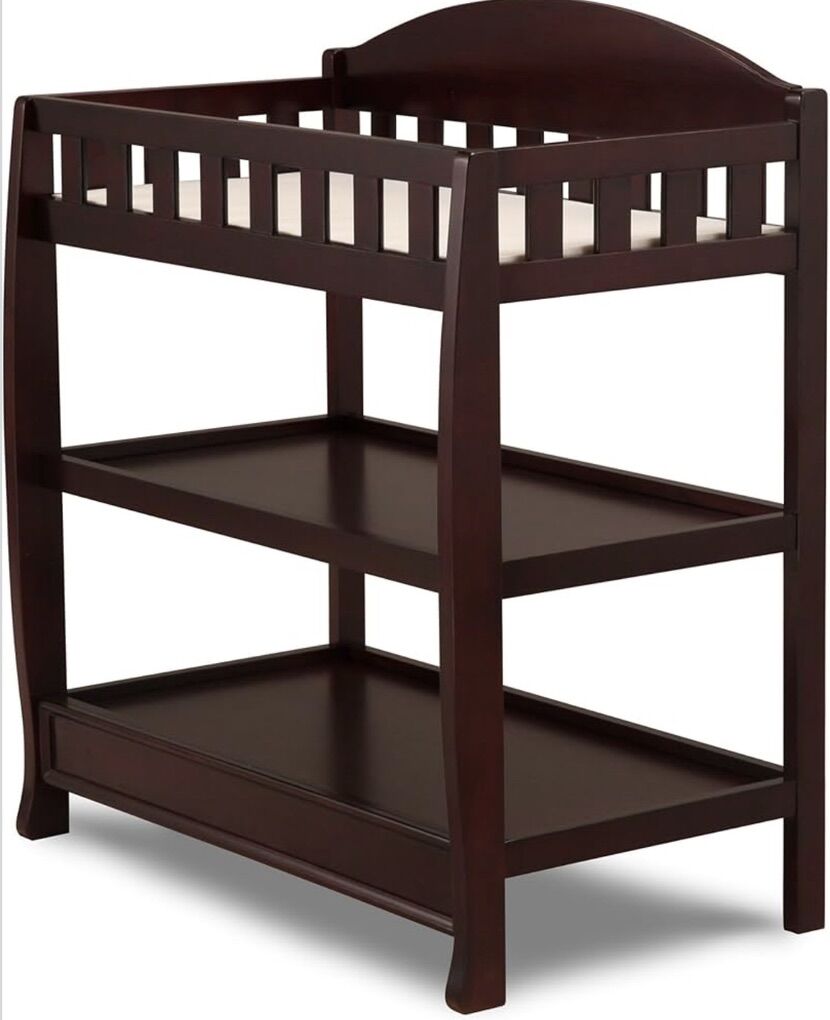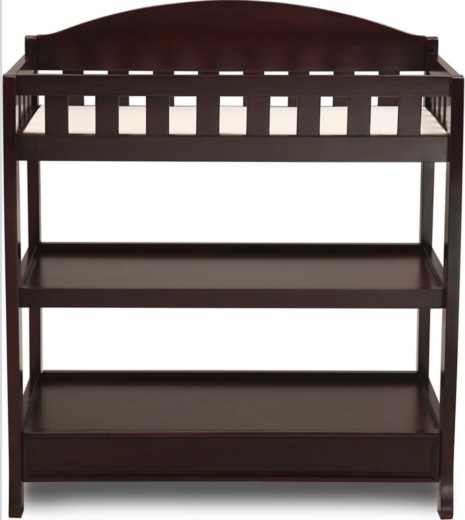 VenmoThis baby diaper changing table has normal wear and includes the molded pad, underpad, and three changeable covers for the molded pad. This is the espresso cherry wood finish of the Delta Children Infant Changing Table with Pad.