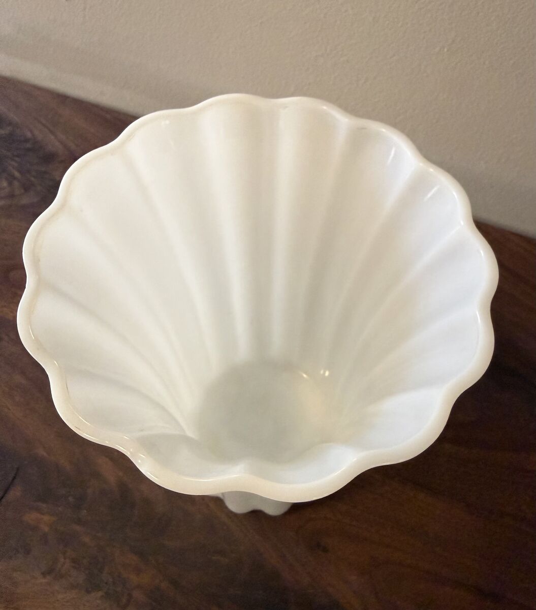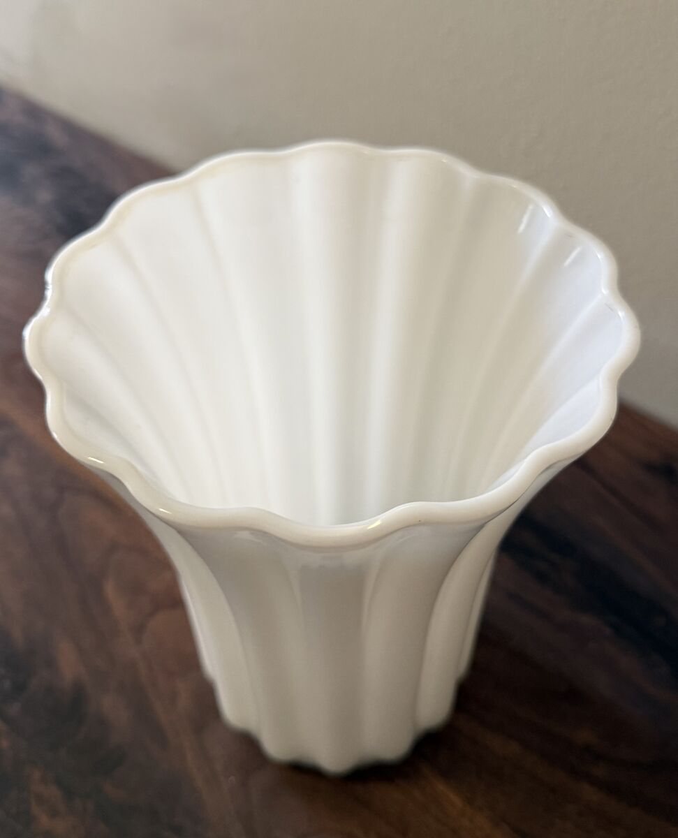 VenmoBeautiful wide mouthed milk glass fluted vase. 15 cm rim diameter, 10 cm base diameter and 19 cm tall. Art Deco Circa 1940s-50s. Small chip on rim.
