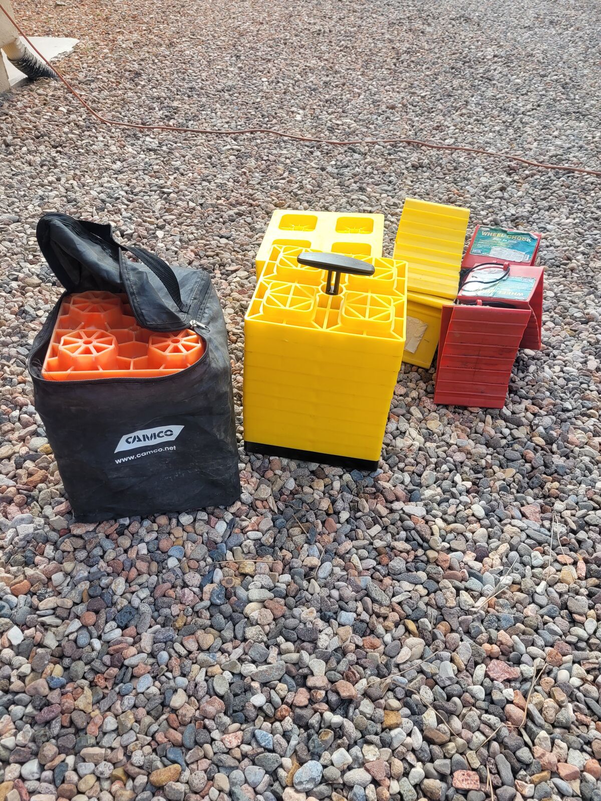leveling blocks and wheel chucks, 3 sets: one new $15, one used but like new $10 and one used $5