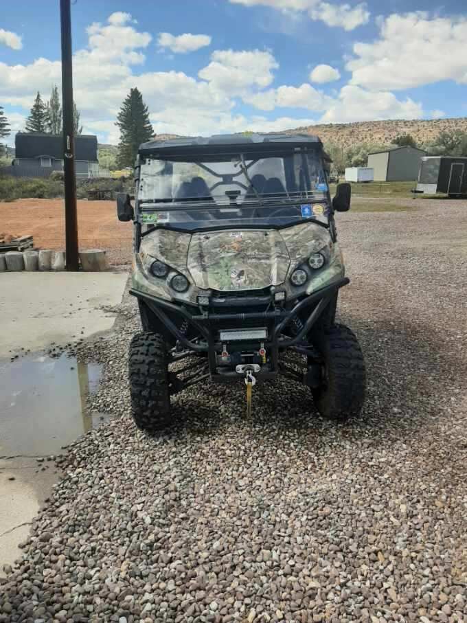 2016 Kawasaki Teryx4 Camouflage 4 seat Side by Side. Includes new full enclosure Yearly maintenance completed 3900 miles. Street Legal Kit Installed. Light Bar up front, Has a 2” lift kit installed. 2 piece windshield that can open all the way or part way for fresh air has hand operated windshield wipers. Chrome wheels, Newer 8 ply tires, Roof, Tool Box in the bed, yearly maintenance done, Hitch, Wench, New Battery, Battery tender, Rear plastic Enclosure. Added an extended bed great for your extra Gear. Rugged yet a comfortable ride. Handles trails and back country with ease. Also Included a mounted gun rack. It’s an awesome machine and in Great Condition. Asking $8,650 OBO