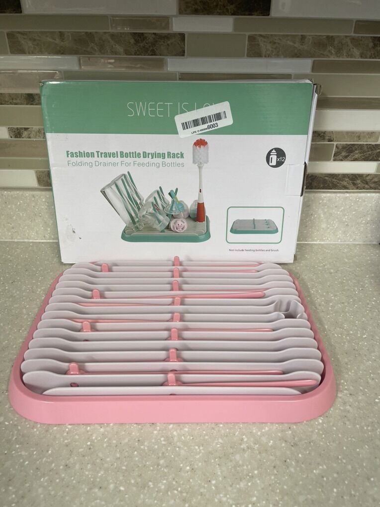 VenmoBaby Bottle Drying Rack Dryer Space Saving Travel Holder for Pump Cup Accessories(Pink) Sweet Is Love folding travel baby bottle drying rack. • It is designed for drying feeding bottles and accessories while traveling. • The rack folds flat for compact storage and portability. • It is made from safe, durable, and tasteless ABS+PP materials.