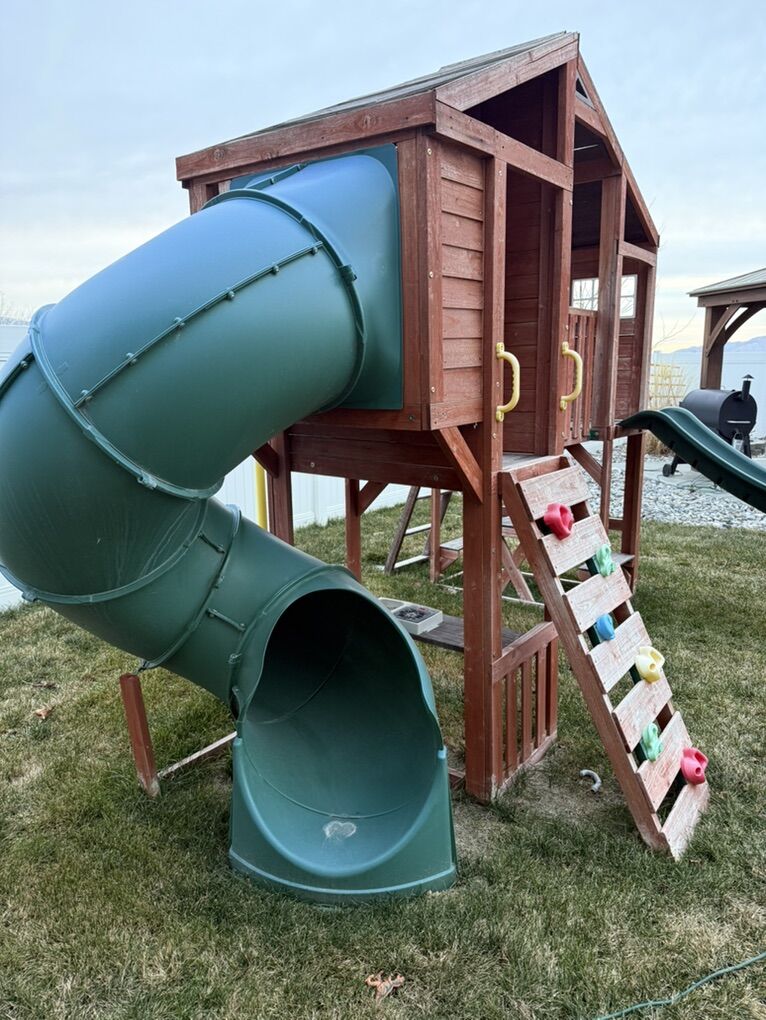 Kid craft playset includes rock climbing wall, two slides, firemen pole kitchen, seating area, and chain bridge. Our kids have outgrown it. Asking $200. Pickup in Stansbury Park. Must disassemble.