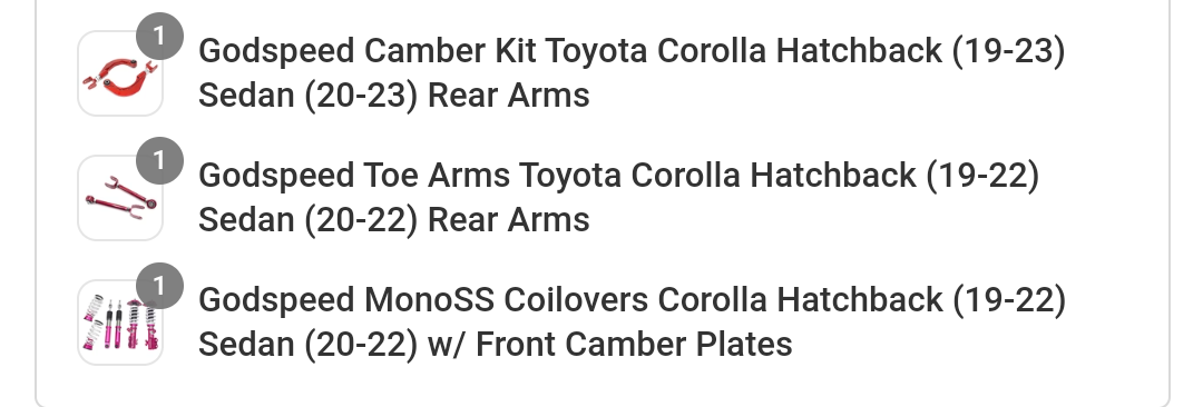 Godspeed MonoSS Coilover with Camber and Toe Kits - Toyota Corolla Hatchback 2019 - 2022, Corolla Sedan 2020 - 2022. Brand New, never installed. Price is OBO. Make an offer.