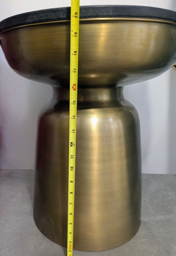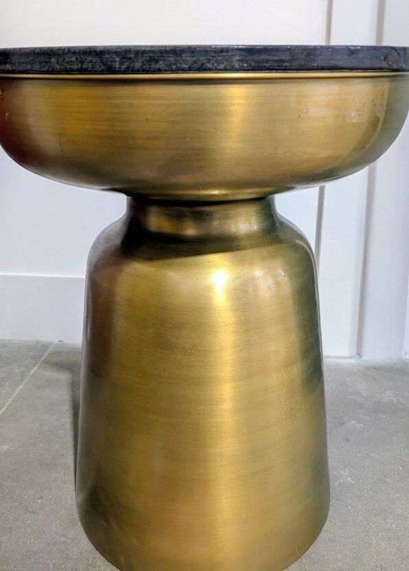 VenmoStriking sculptural accent table featuring a warm brushed brass–tone metal base paired with a contrasting black stone top. The pedestal silhouette gives this piece a high-end, design-forward look that works beautifully as a drink table, sofa-side accent, or display stand.