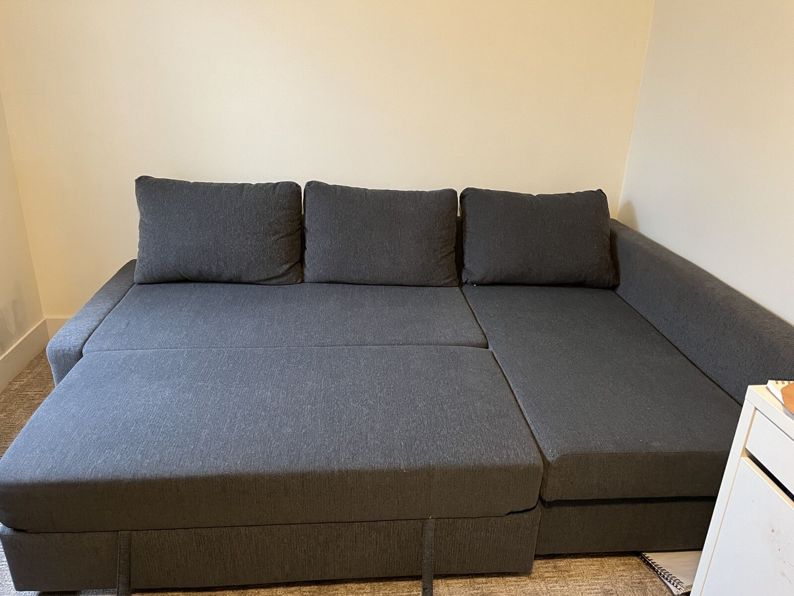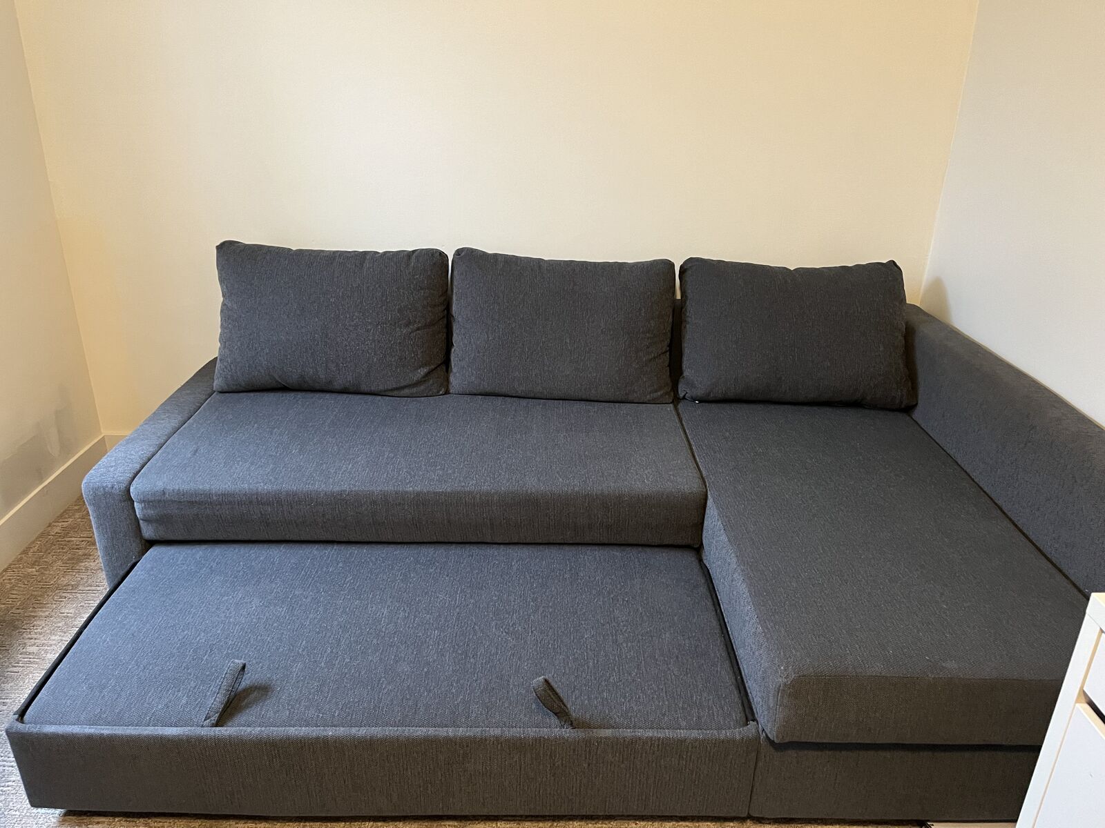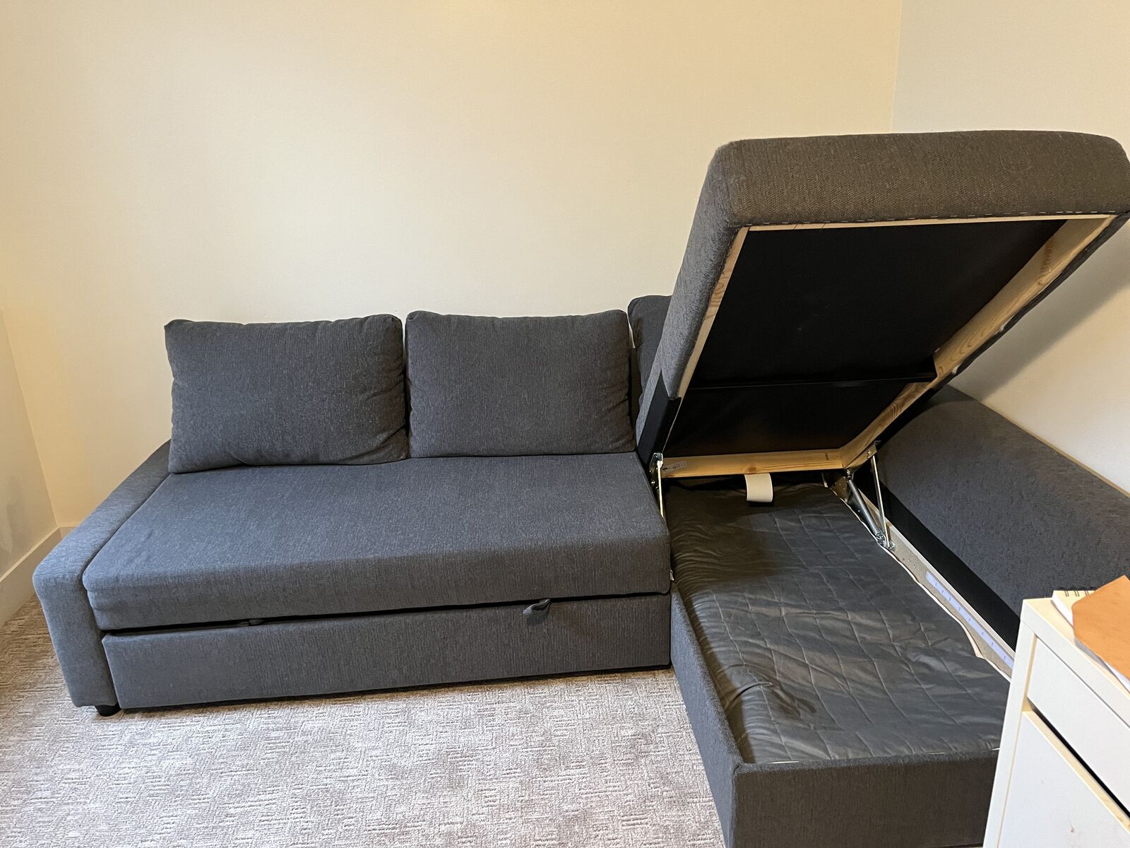 VenmoGray Ikea sofa with storage; section stores underneath and can be pulled out for sleeping or lounging. It can be put together to have the lounge section on either side. In good condition, clean, no damage. We do have a dog that has been on it though if allergies are a concern. It is in pieces, but complete with all hardware, ikea tools and instructions. New it is $1000