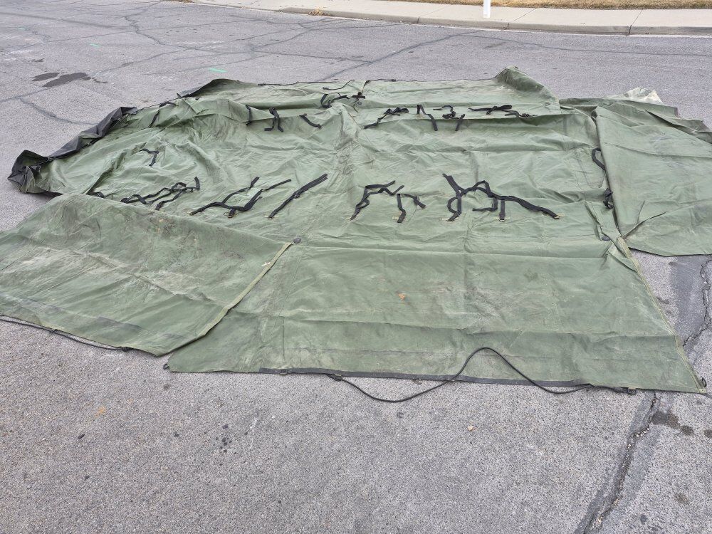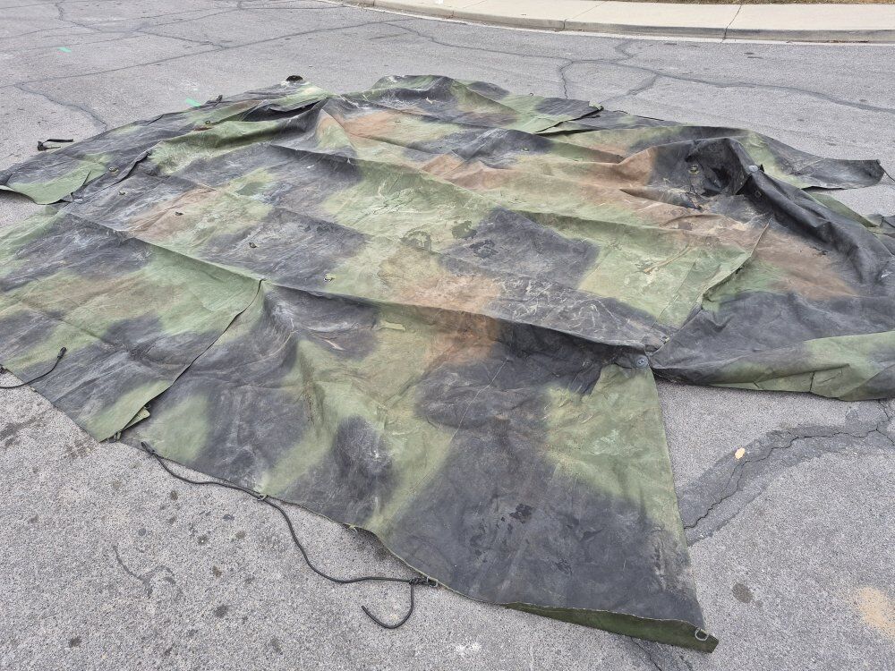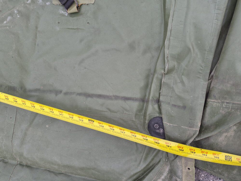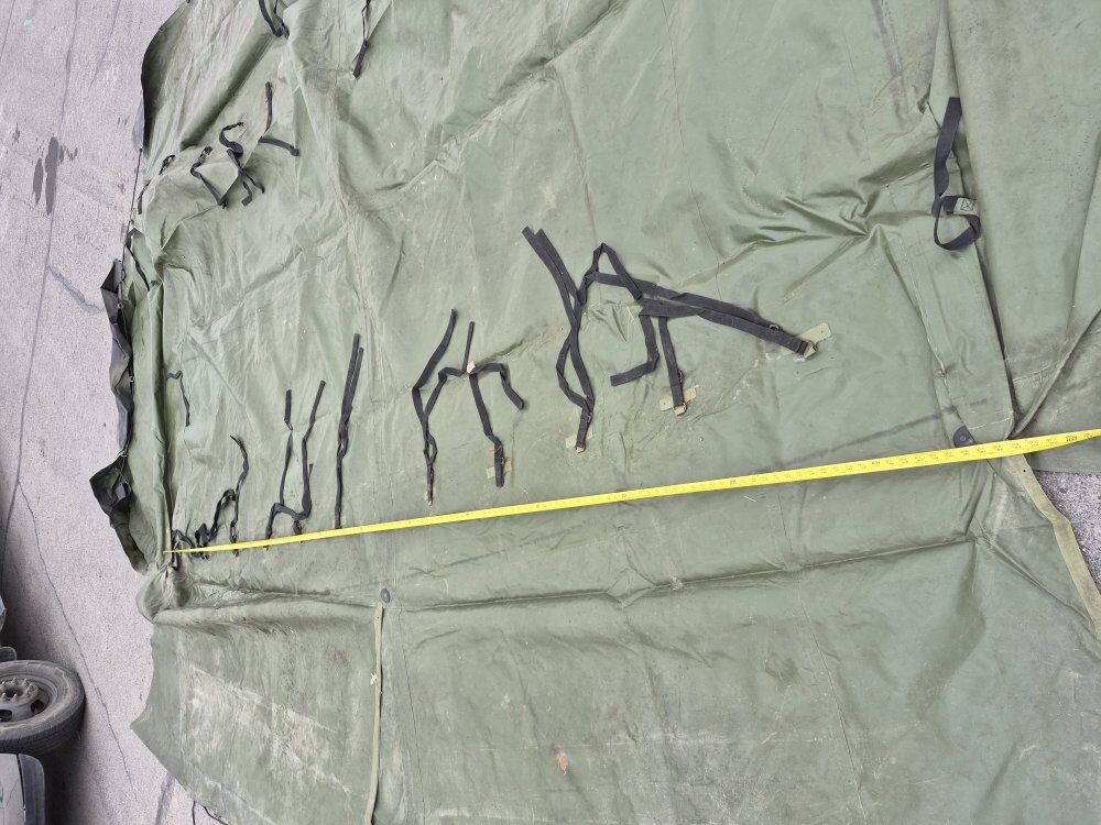 Good used camoflauge cargo cover. Some of the elastic bungie material is missing, but is easily sourced by the roll. No rips or tears. nice and flexible, not stiff and rigid.