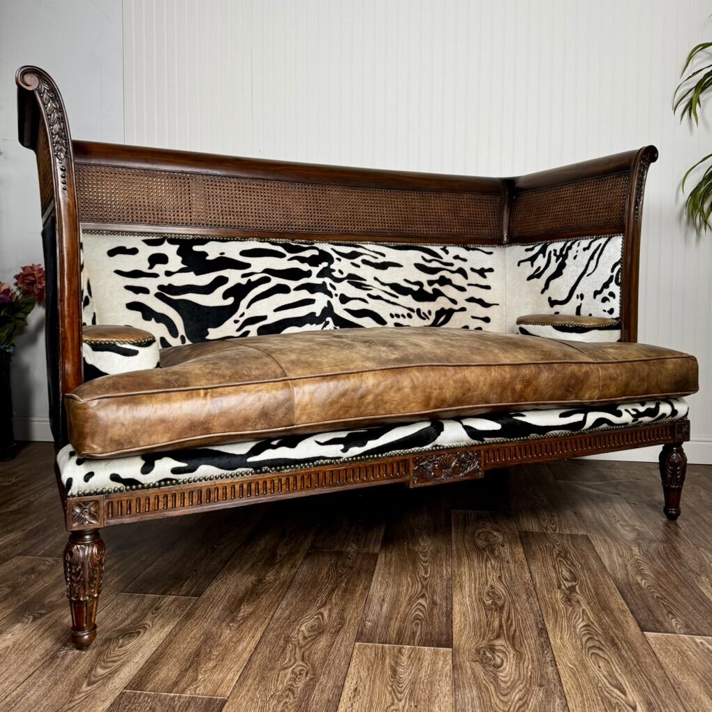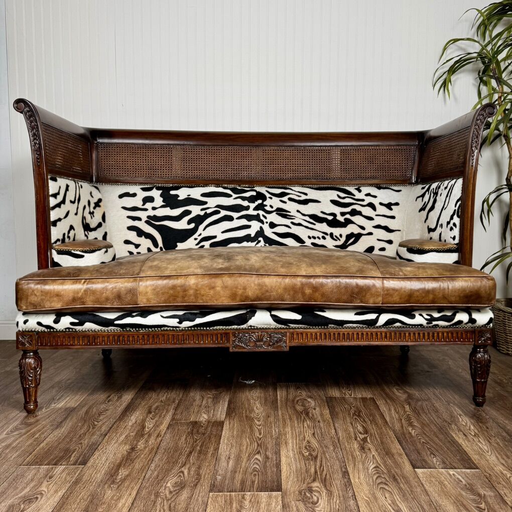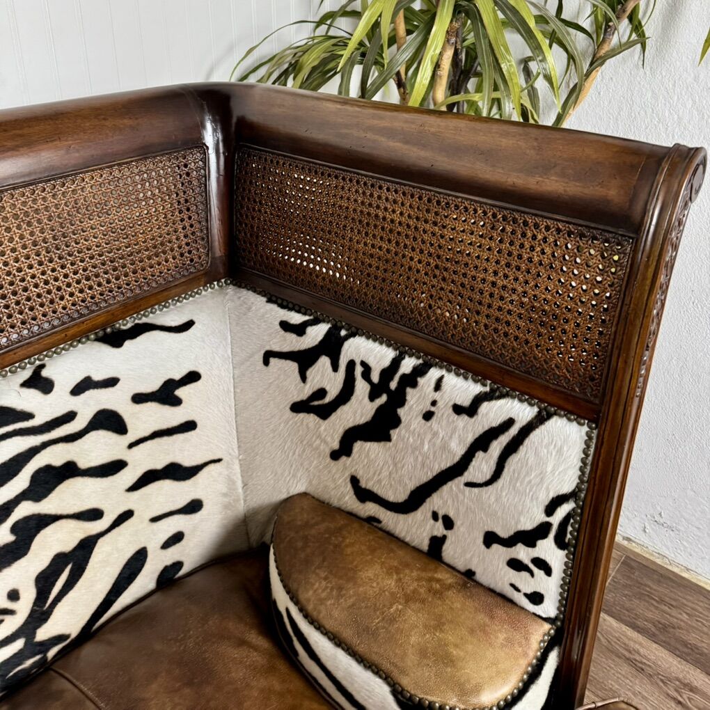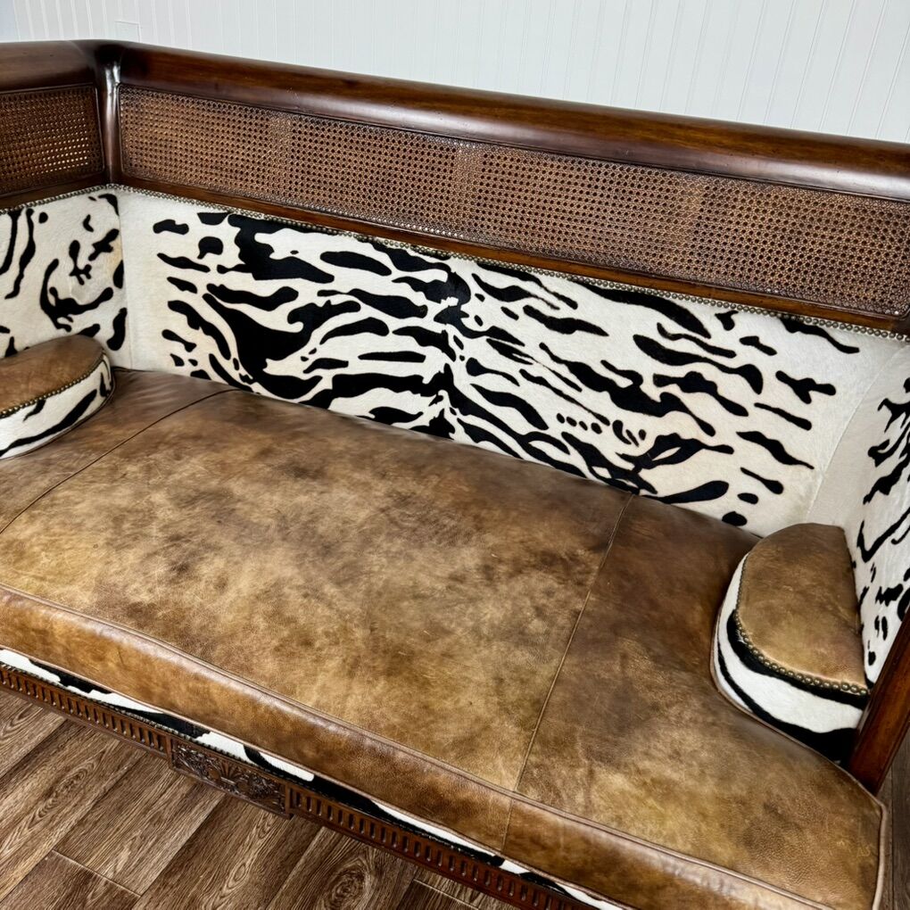 This piece features solid, hand-carved mahogany; hand-woven rattan caning (in excellent condition—no tears); high-quality aged leather; and faux baby zebra hair-on-hide. With its elegant silhouette and luxury global design, this settee would fit well with maximalist, British Colonial, or safari chic styles. Minor signs of wear but overall great condition. See pictures for details.