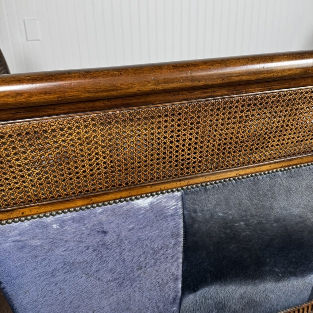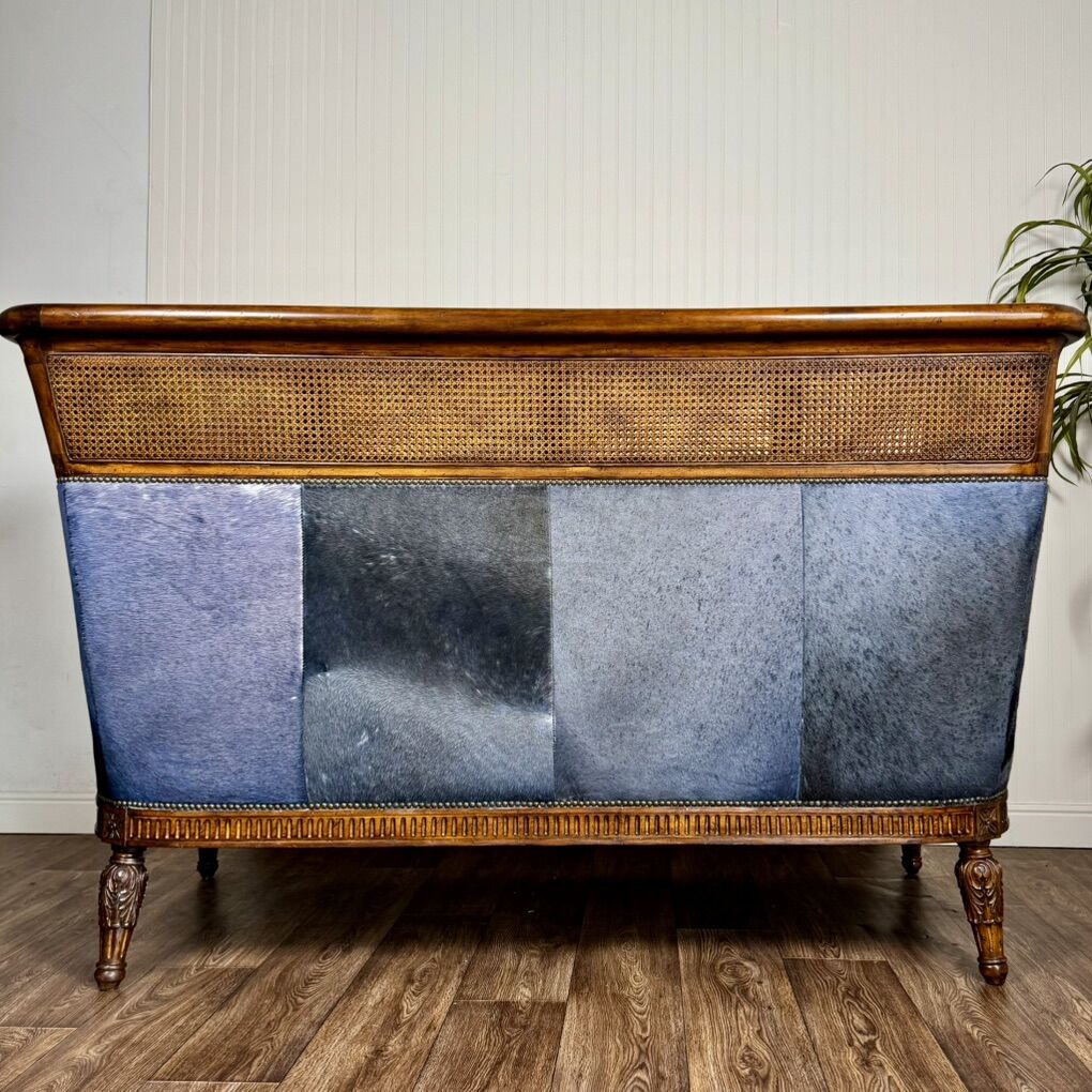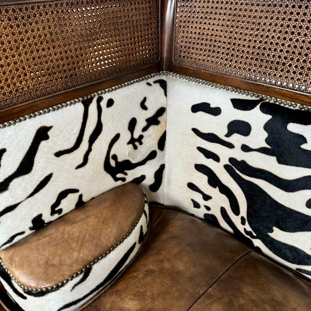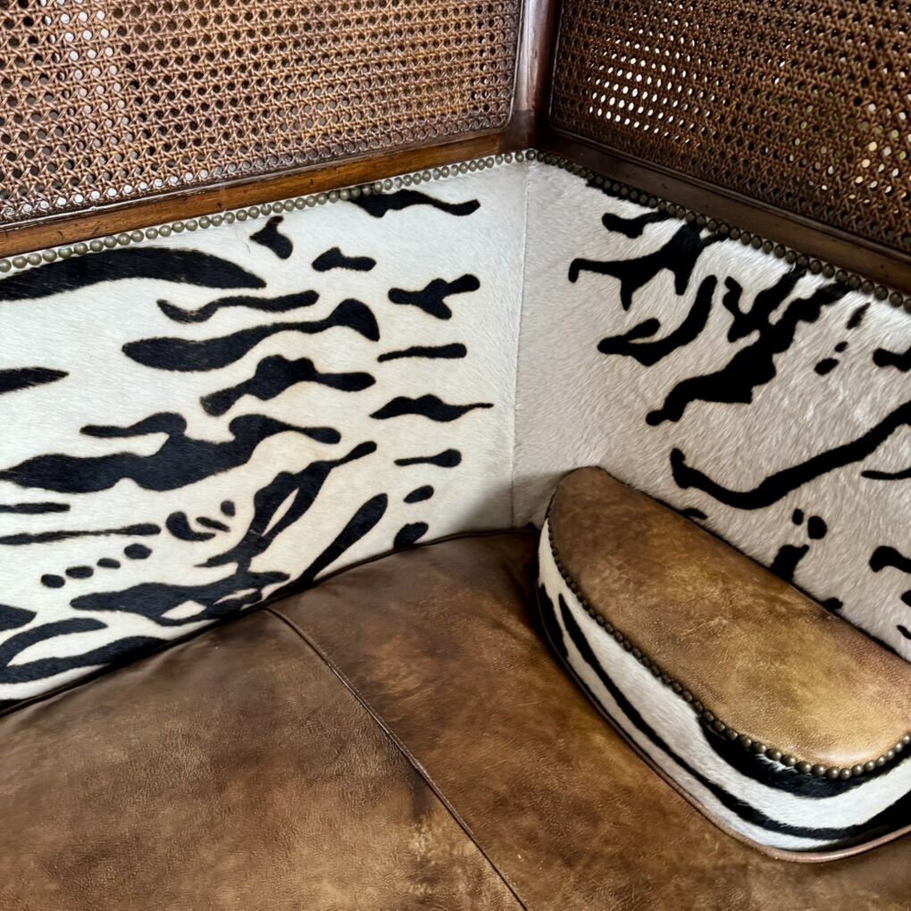 This piece features solid, hand-carved mahogany; hand-woven rattan caning (in excellent condition—no tears); high-quality aged leather; and faux baby zebra hair-on-hide. With its elegant silhouette and luxury global design, this settee would fit well with maximalist, British Colonial, or safari chic styles. Minor signs of wear but overall great condition. See pictures for details.