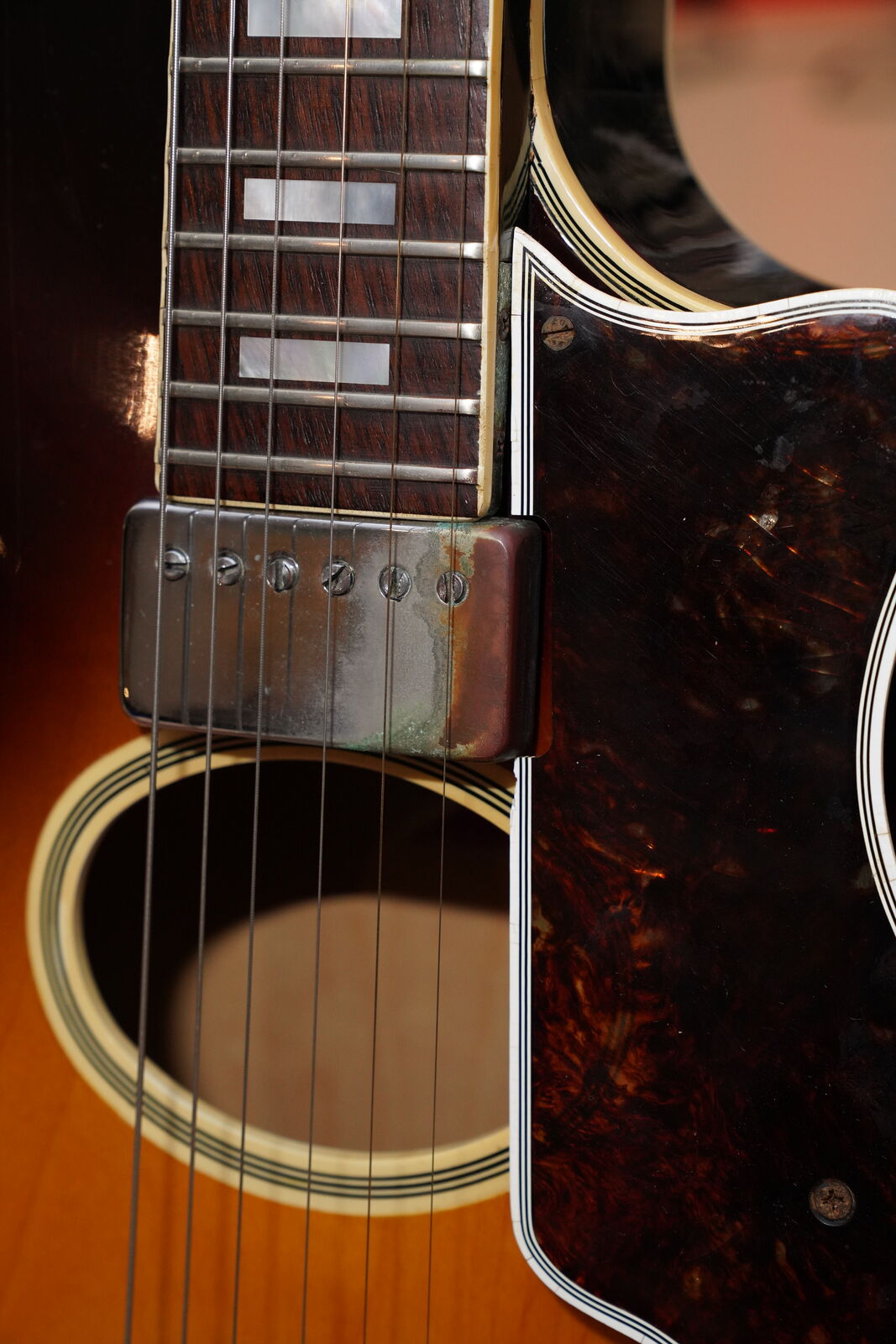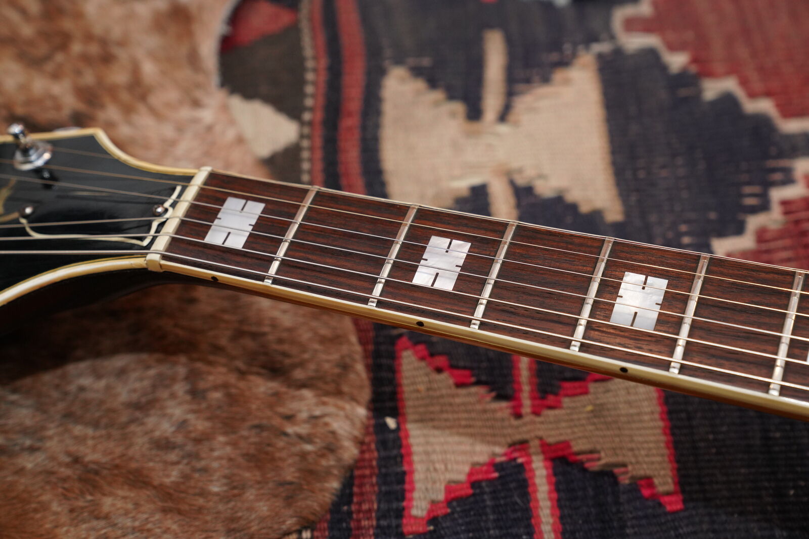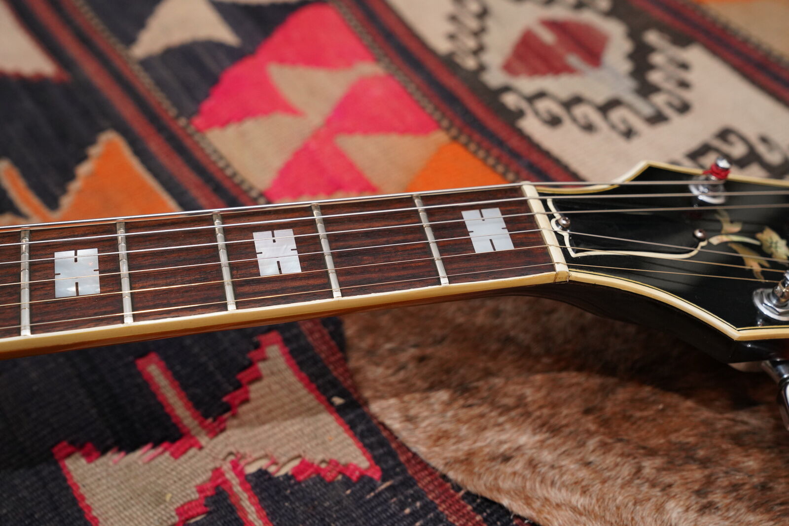 This one is completely original including the frets. There is very little playwear on the frets and Brazilian Rosewood fingerboard. The pick guard is original and the pick guard hardware is included but the bracket that supports the pick guard has been replaced. As is the very common on these, the original pickguard exhibits signs of off gassing and has deteriorated the chrome on the pickguard cover. All the parts of the guitar are original including the branded tail piece, pots, knobs and bridge as well as the tuners and truss rod cover.