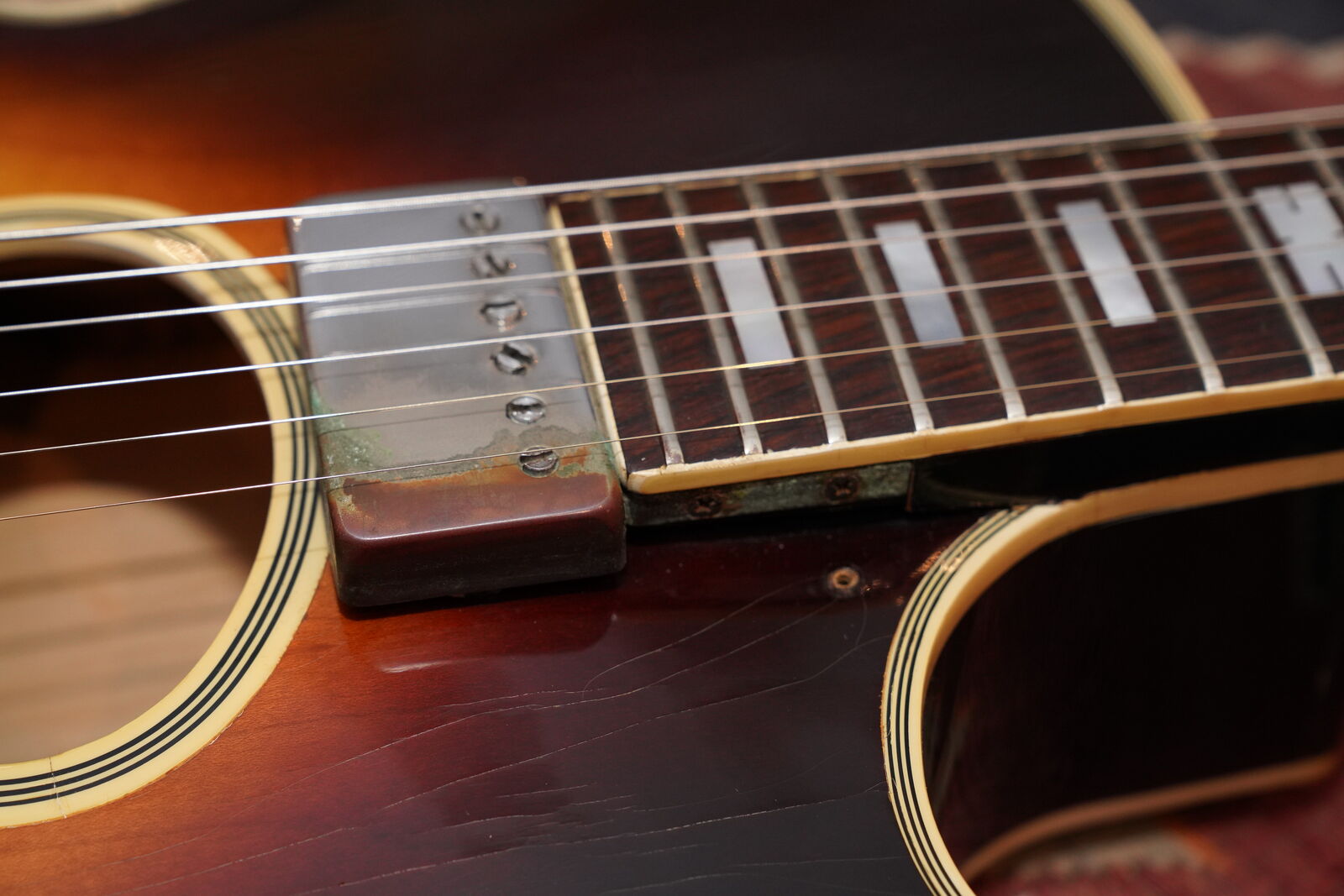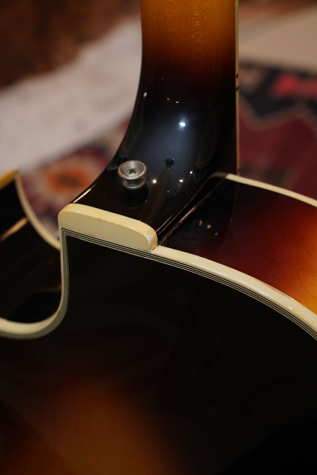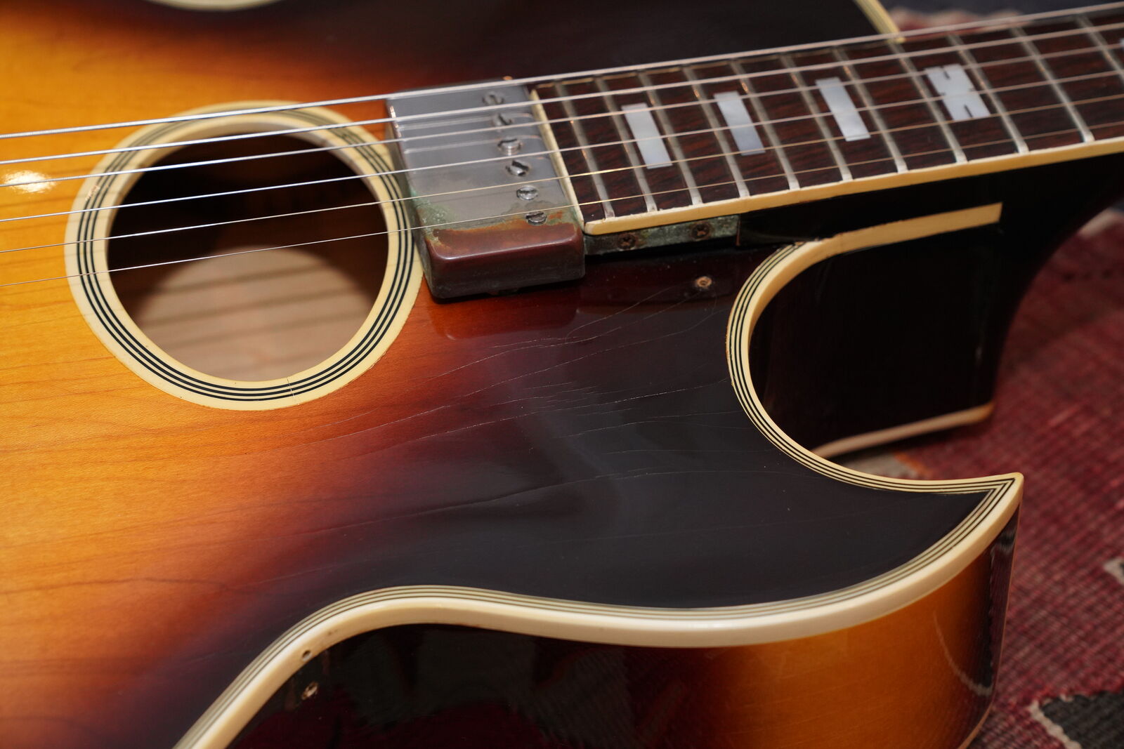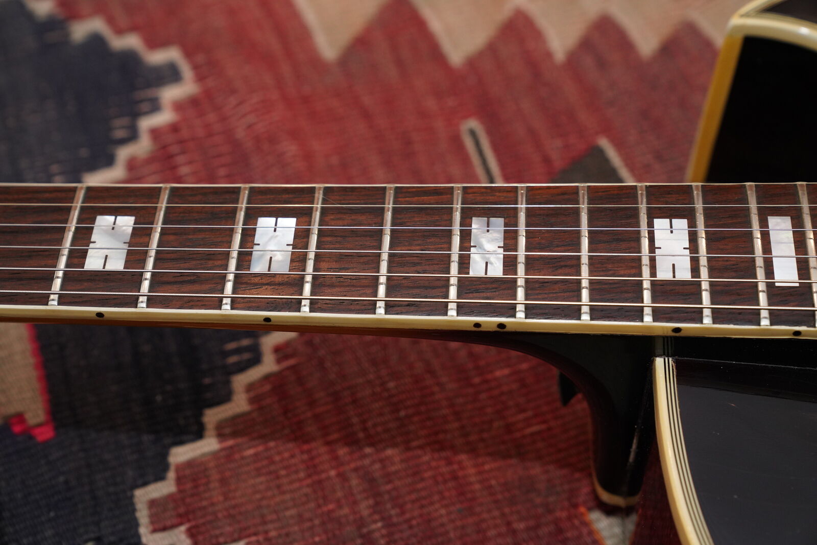 This one is completely original including the frets. There is very little playwear on the frets and Brazilian Rosewood fingerboard. The pick guard is original and the pick guard hardware is included but the bracket that supports the pick guard has been replaced. As is the very common on these, the original pickguard exhibits signs of off gassing and has deteriorated the chrome on the pickguard cover. All the parts of the guitar are original including the branded tail piece, pots, knobs and bridge as well as the tuners and truss rod cover.