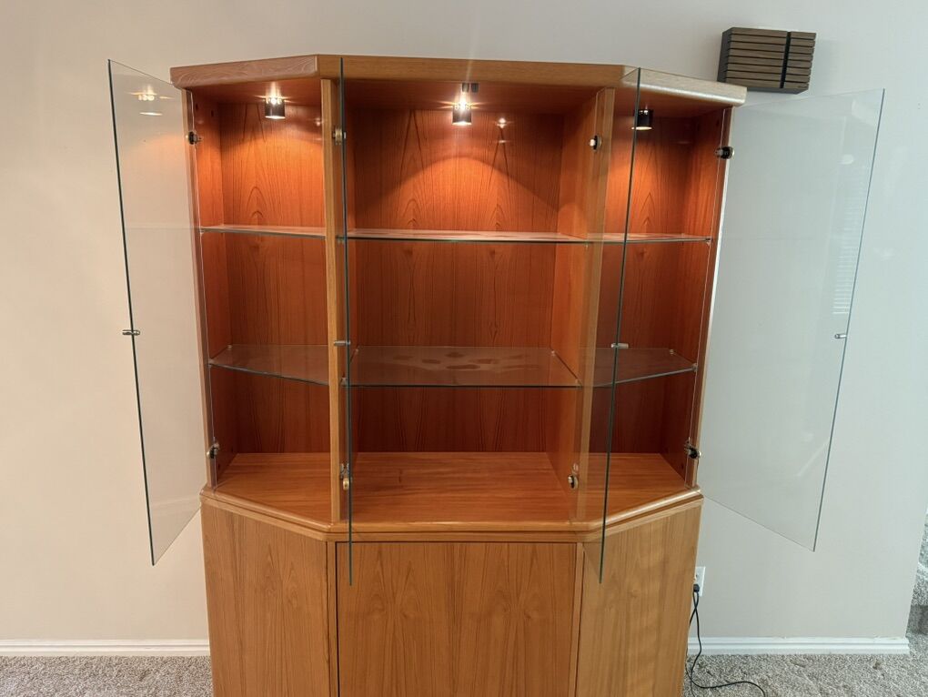 All wood, glass adjustable shelves, Two piece, 3 lights. 56 inches wide x 72 inches tall x 20 inches deep.