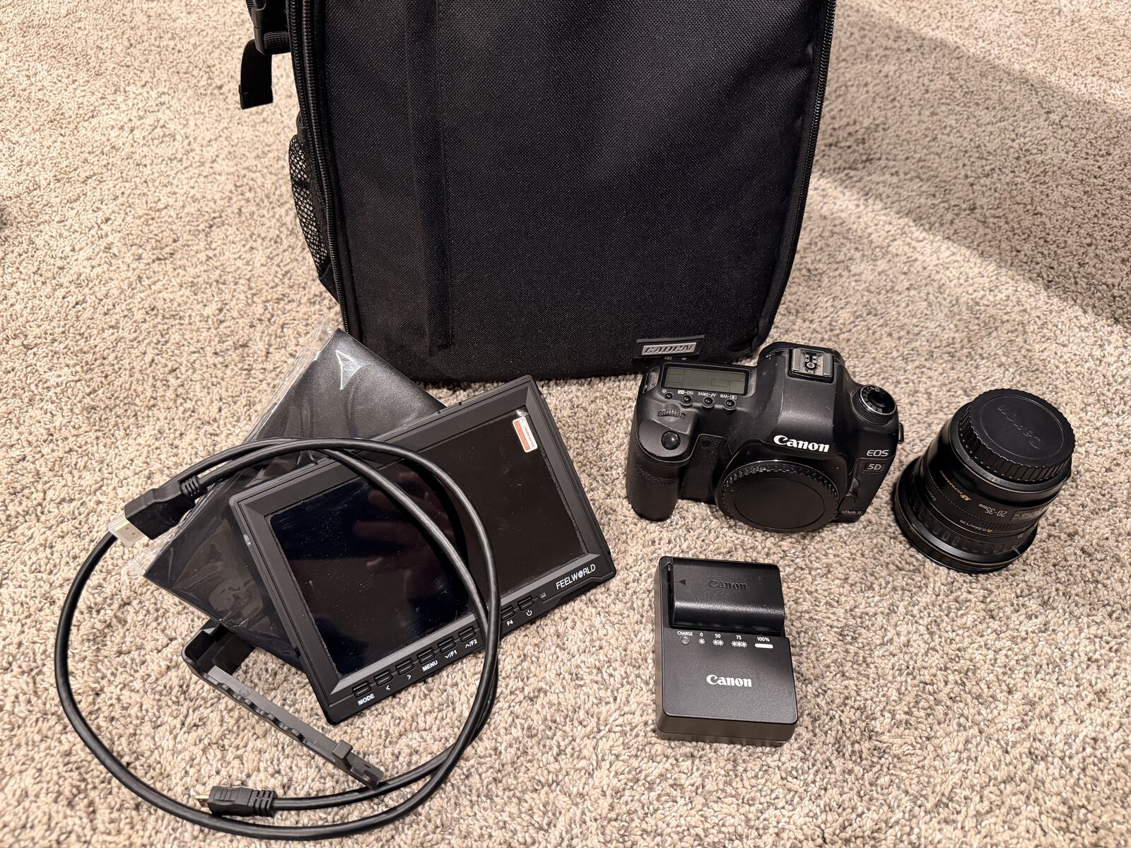 ApplePayCanon Mark II 5d in good condition. Not sure of shutter count. Received as gift and havent used much. Includes a brand new external monitor with shade, 20-35mm Canon lens and new camera bag.