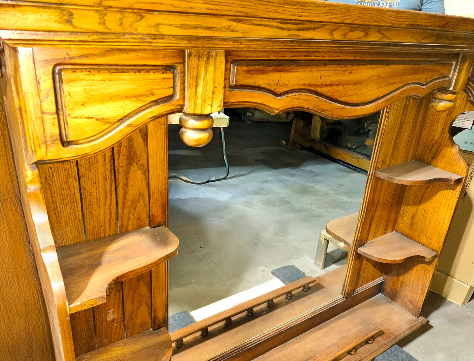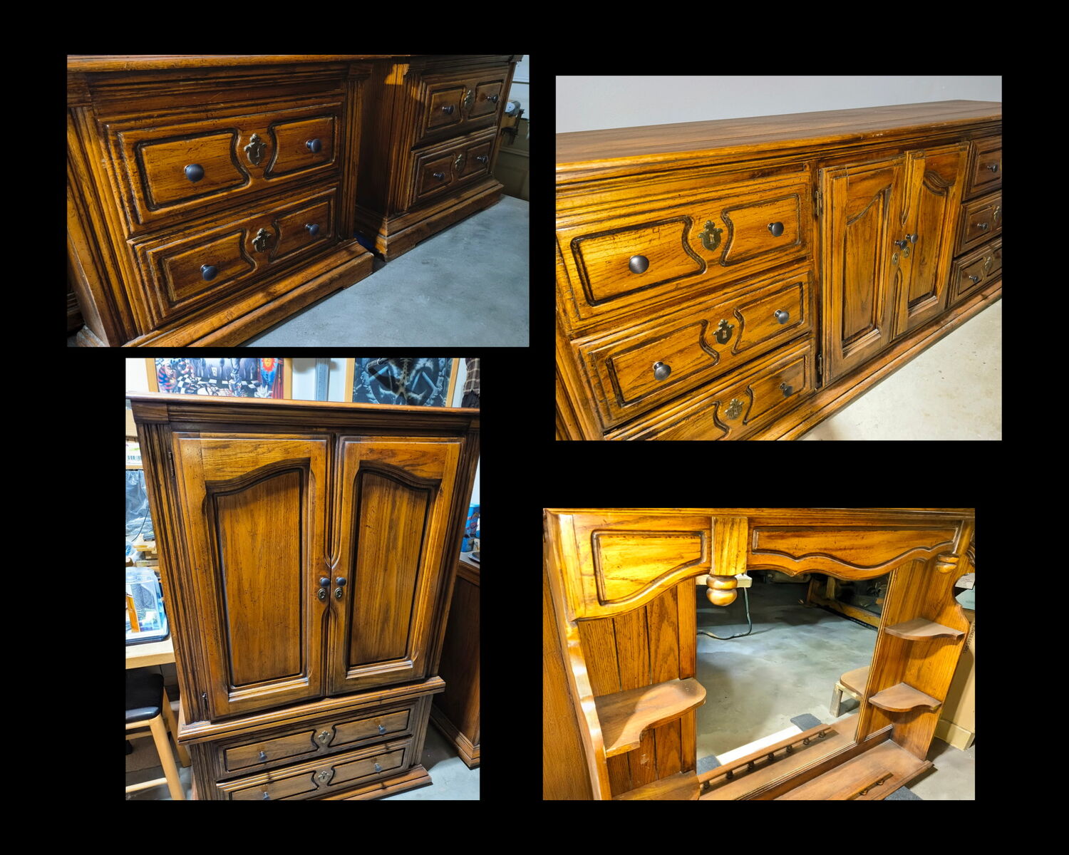 CashAppBeautifully maintained, vintage Ashley Furniture B500 Series bedroom set. This is a complete, matching collection in a classic Mediterranean / Spanish Colonial Revival style. Known for its sturdy construction and ornate detailing, this set features heavy oak grain textures, arched raised panels, and original antique-brass finished hardware.