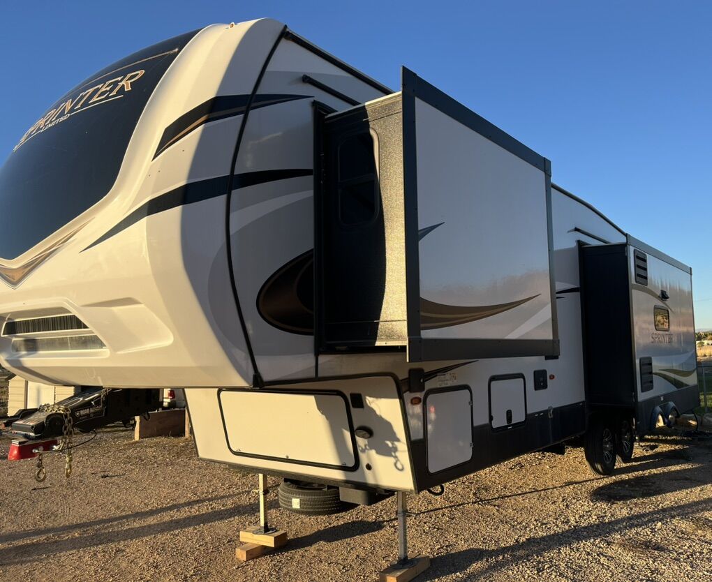 2021 Keystone Sprinter 3190RLS. Less than 1500 miles. In excellent condition. 2 rooftop air conditioners 36” LED Crystal Flame electric fireplace gas range 50” TV insulated/winterized package large 4 door refrigerator 3 pop-outs electric awning RV King size bed with Travel Happy memory foam mattress bumper rear hitch receiver washer/dryer ready upgraded connection coupler usb ports throughout living space recliners with massage function auto leveling upgraded surestep stairs Included with sale: back up camera, solar panel, x-chock wheel stabilizers, steel gooseneck tripod stabilizer, large capacity black water tank, 20' sewer hose kit and sidewinder hose support. Sale of white truck in last picture negotiable with the sale of the RV. John 435-224-4985 or Maria 435-241-8077