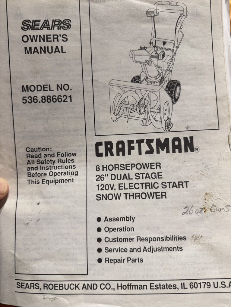 Zelle8 horsepower, 26” wide dual stage Craftsman snow thrower. Impeccably maintained and ready to work. Self drive, headlight and with a spare drive belt.