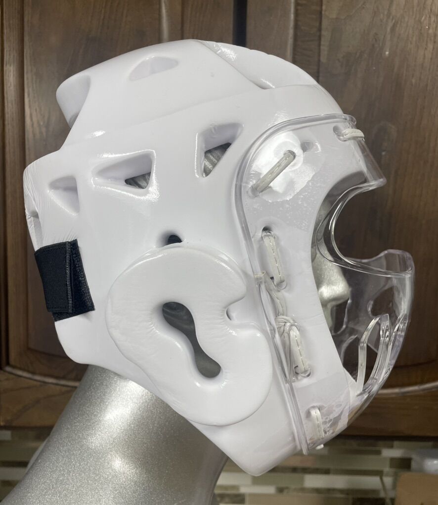 VenmoTaekwondo Head Guard with Face Shield. It features a lightweight, shock-absorbent dipped foam construction. The attached face shield is made of durable polycarbonate. It is designed to prevent uncomfortable pressure on the neck and ears.