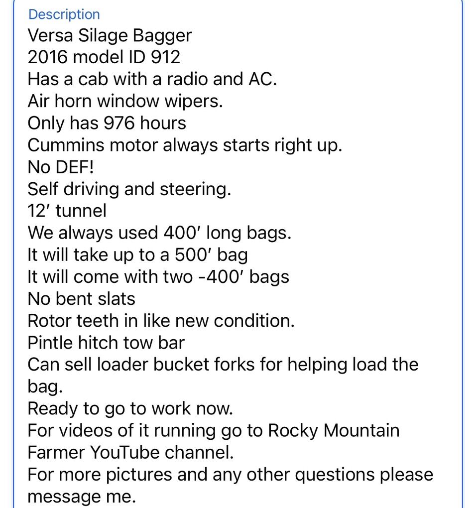 Versa Silage Bagger 2016 model ID 912 Has a cab with a radio and AC. Air horn window wipers. Only has 976 hours Cummins motor always starts right up. No DEF! Self driving and steering. 12’ tunnel We always used 400’ long bags. It will take up to a 500’ bag It will come with two -400’ bags No bent slats Rotor teeth in like new condition. Pintle hitch tow bar Can sell loader bucket forks for helping load the bag. Ready to go to work now. For videos of it running go to Rocky Mountain Farmer YouTube channel. For more pictures and any other questions please message me.