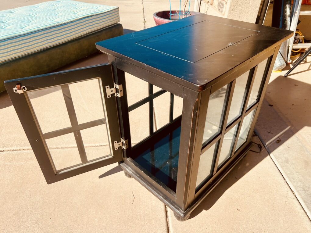 ApplePayThis is a black wood end table curio cabinet with a glass front door, bun style feet with light inside.