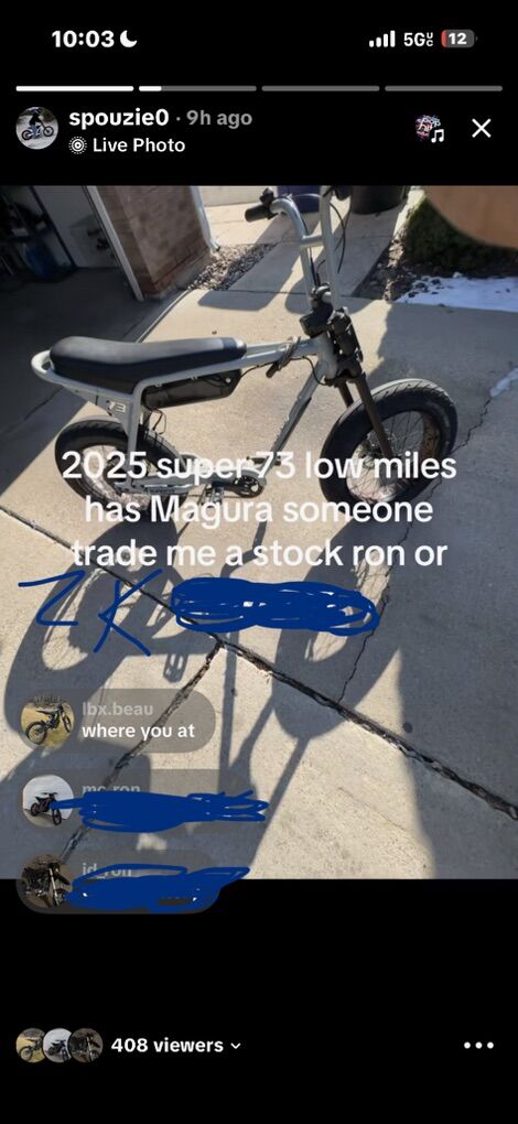 Ignore: Super 73 talaria Surron E ride rtr rawr mantis Ultra bee Hyper bee ridstar macfox zooz