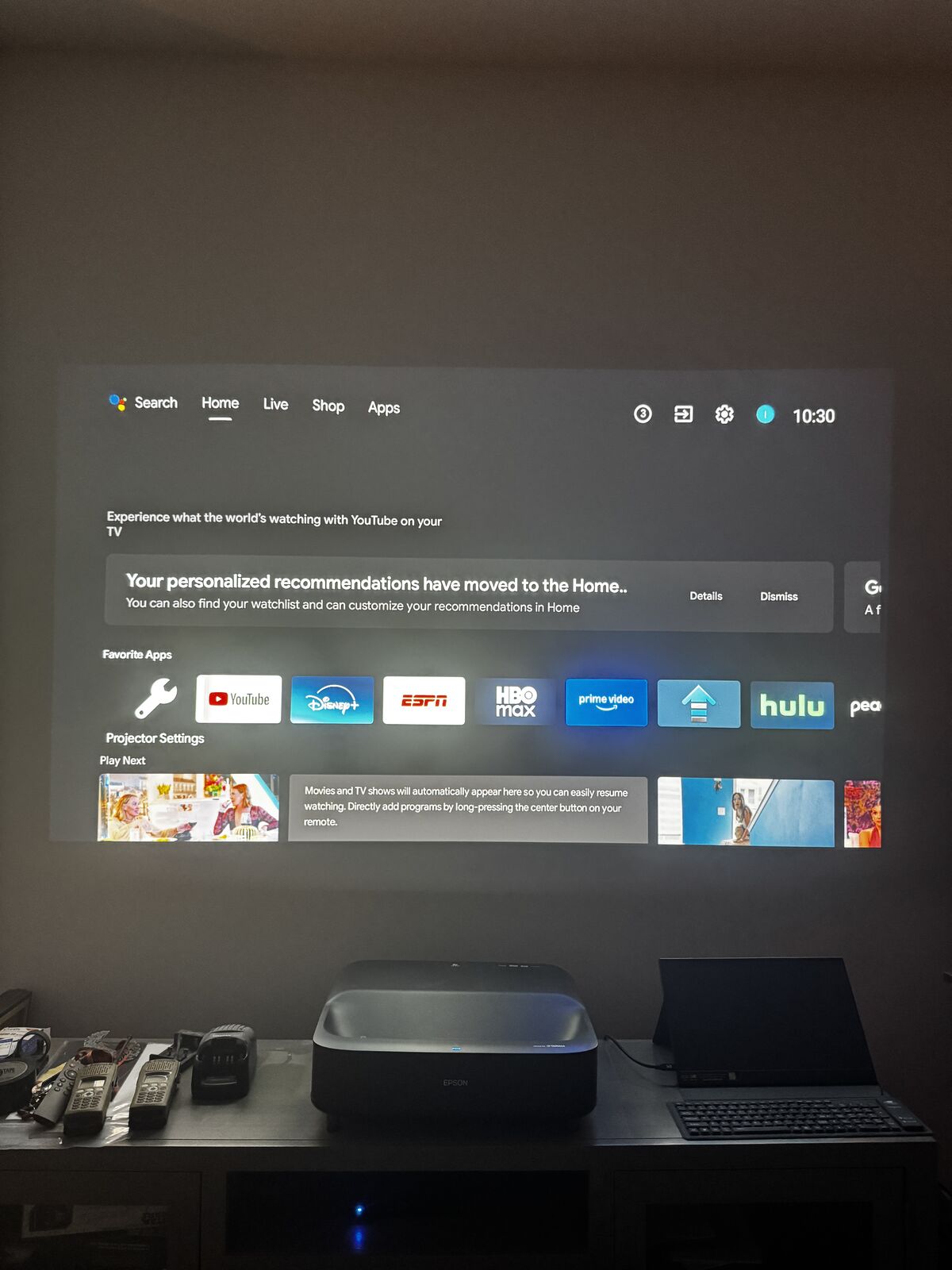 VenmoGreat condition ultra short throw Epson projector. Bought on Amazon ~6 months ago, about 120 hours of use. Selling because I no longer am using it since I got a different setup. Great HD projector for the price, especially since it has a speaker system and Android TV built in.