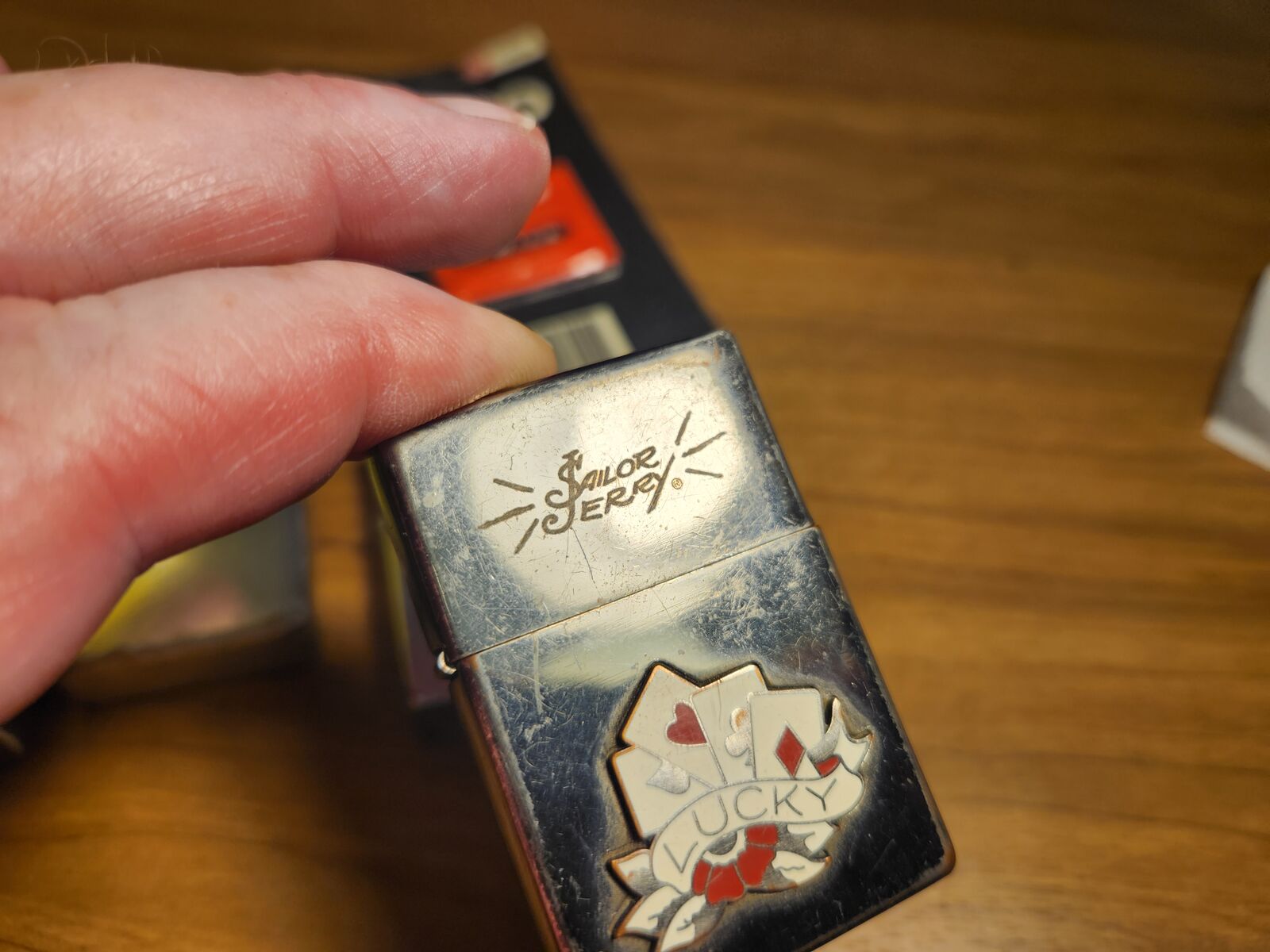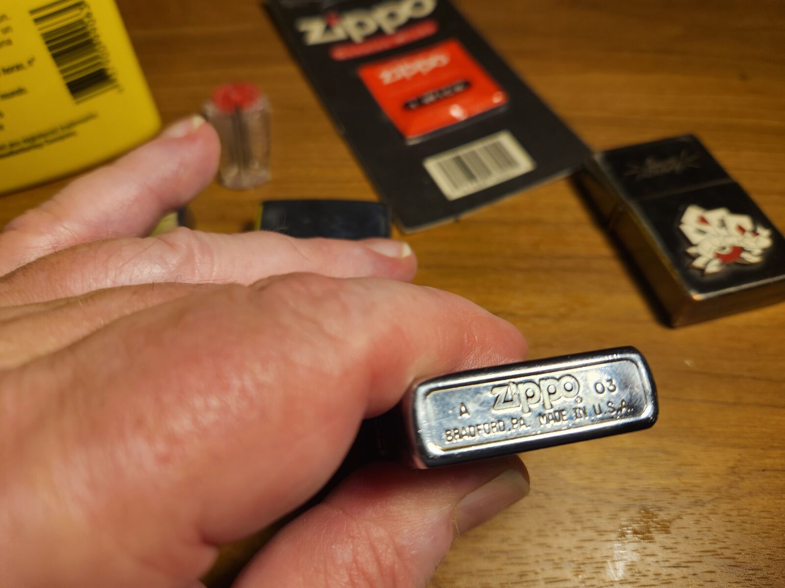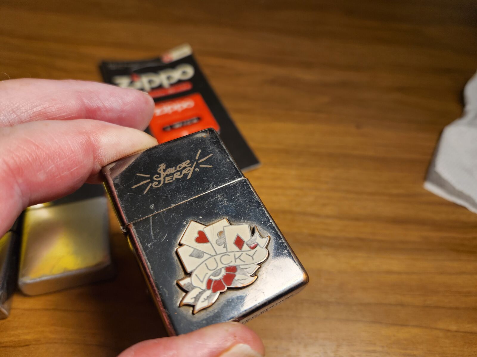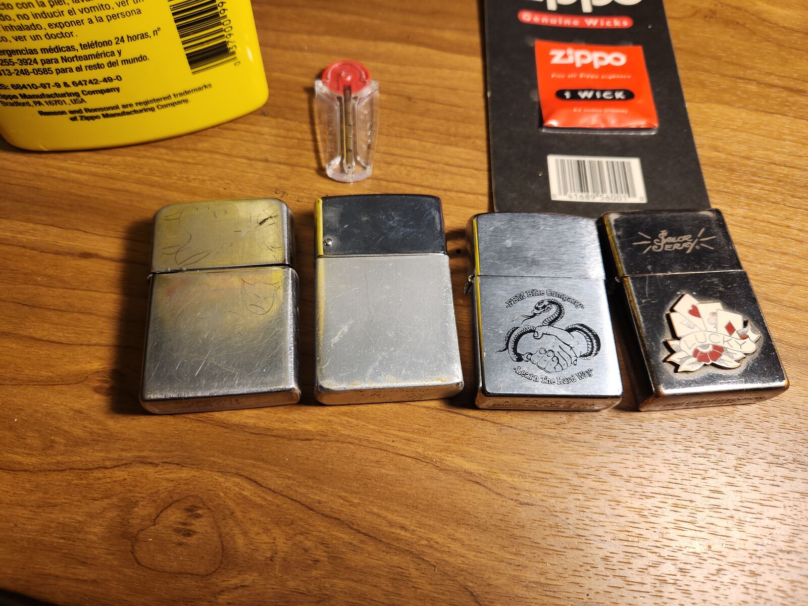 NOTE: One lighter is Zippo, one is Ronson, one is Sailor Jerry (Zippo?), and one is unknown. All work prefect as shown. The bottle of lighter fluid is about 1/3 full. Nice collection of wind-proof lighters.