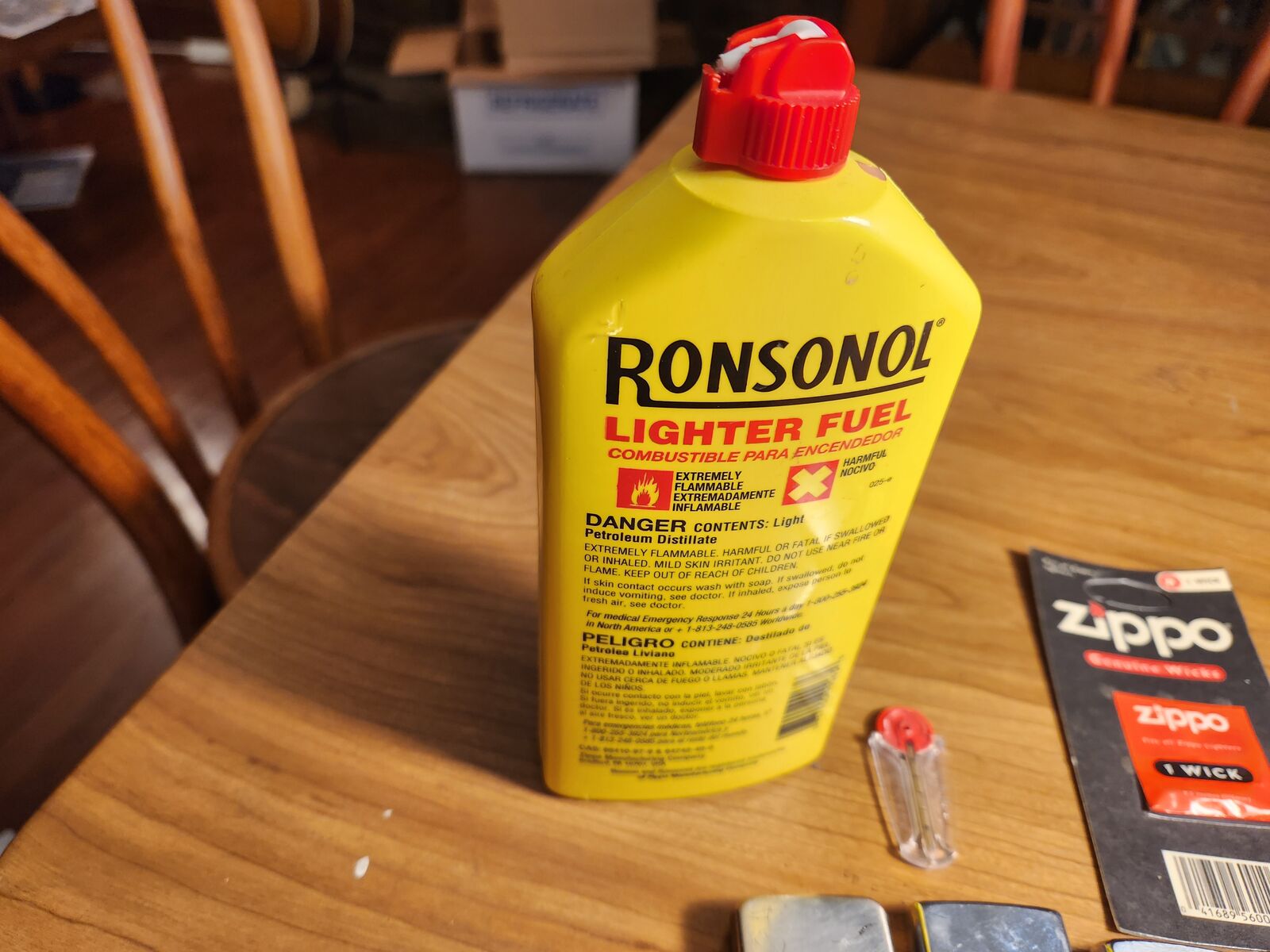Four working Zippo lighters, 6 flints, one wick, and Ronson lighter fluid.