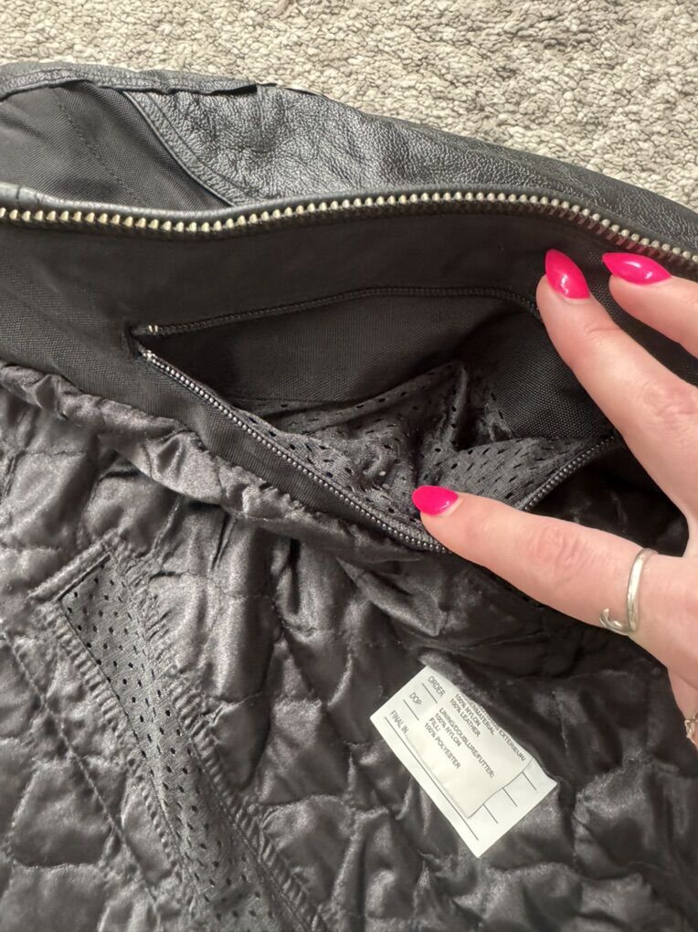 The jacket is in really good condition. The interior is clean and well cared for, and the leather has been recently conditioned. The only flaw is minor cosmetic wear to the decorative wire detail on the flame design (shown in photos). This does not affect fit, comfort, or function.