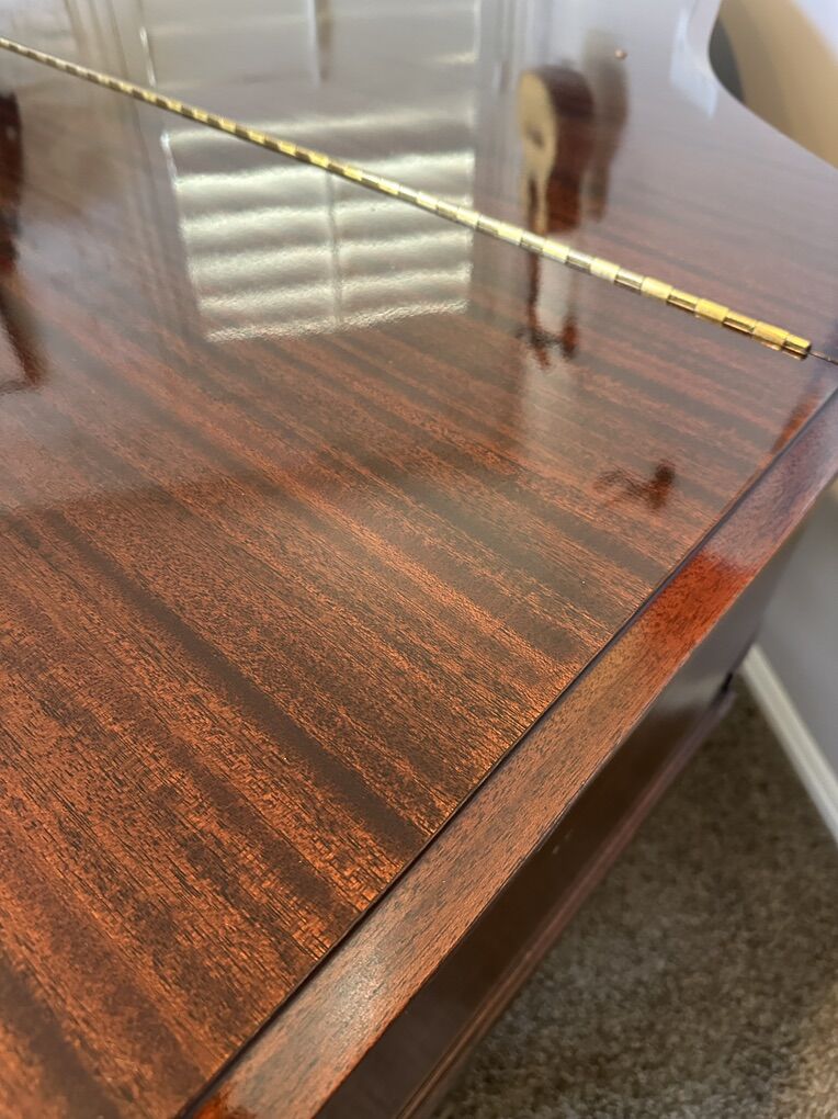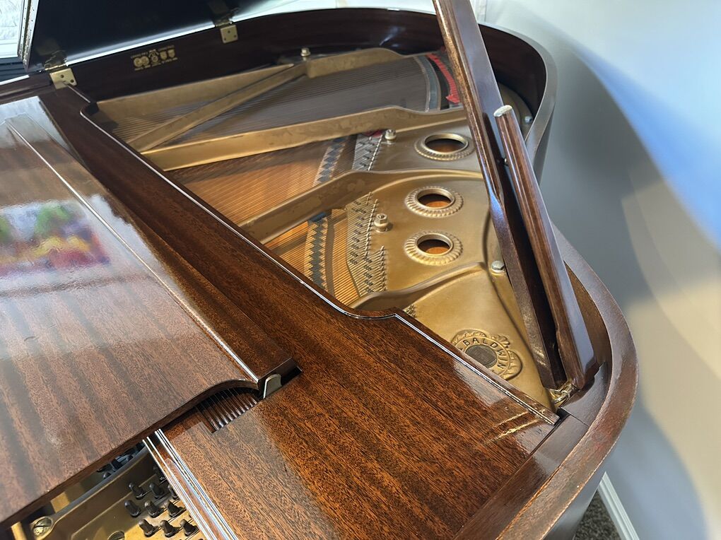 • Case refinished – warm, beautiful appearance • Hammers reshaped for improved tone • Action regulated for smooth, even touch • Interior fully cleaned • Tuned and ready to play • Soundboard, bridges, and plate in excellent condition • Pre-Artist-Series Baldwin quality (same construction principles later used in Artist Series) • Golden-age American craftsmanship • Warm, resonant tone with impressive projection for a 5'2 grand • Highly figured walnut damper heads – a premium early Baldwin detail • Perfect soundboard • Gorgeous refinished mahogany • Ideal home size – compact but full-sounding • A high-end American piano at a far better price than Steinway or Mason & Hamlin • Cosmetics: Very good • Action: Responsive, even, regulated. A glissando on this action is simple and light. • Soundboard: Excellent • Strings: Original but clean and healthy • Plate/frame: Clean and solid • Overall: Beautiful, reliable, and musically satisfying. Original ivory keys are almost perfect with a small nick on G4 and C5. Pin block is in great condition.