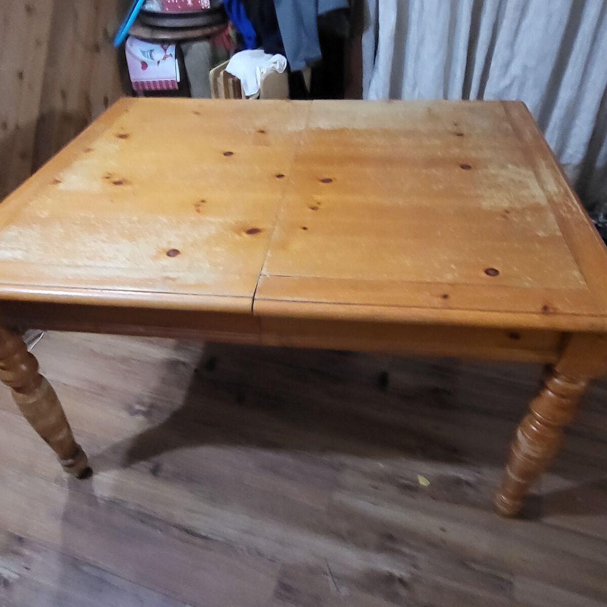 It's a 3 1/2 ft by 4 1/2 ft table with a 2 ft leaf. It shows some wear. But it's a good solid wood piece. Regular height. If you have questions feel free to text. Cash only