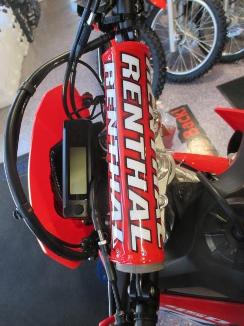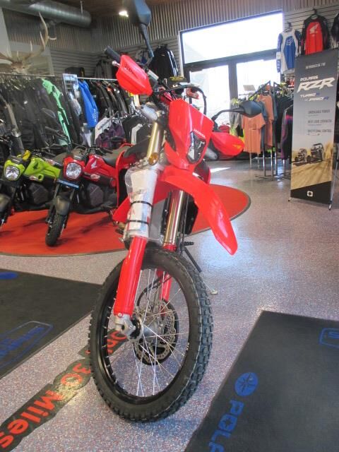 Stock #: H01132 Engine Type: Single-Cylinder Displacement: 27.4 cu. in. (449.7 cc) Bore and Stroke: Bore: 3.78 in. (96 mm); Stroke: 2.45 in. (62.1 mm) Cooling: Liquid Compression Ratio: 12.0:1 Fuel System: Gas Transmission: Manual Front Suspension: Inverted Fork Rear Suspension: Twin Sided Swing Arm Front Brakes: Disc Rear Brakes: Disc Front Tire: IRC GP21: 80/100-21 51P Rear Tire: IRC GP22: 120/80-18 62P Wheelbase: 58.9 in. (1496.1 mm) Seat Height: 37.2 in. (945 mm) Rake: 28.5 Trail: 4.8 in. (122 mm) Fuel Capacity: 2 gal. (7.6 L) Speedometer: Standard Odometer: Standard